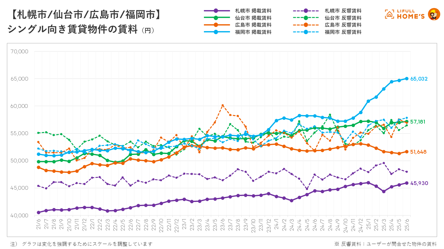 また、福岡市(65,032円)も前年同月比111.7%と、地方4市(札幌市、仙台市、広島市、福岡市)ではとりわけ高い上昇率となっています。