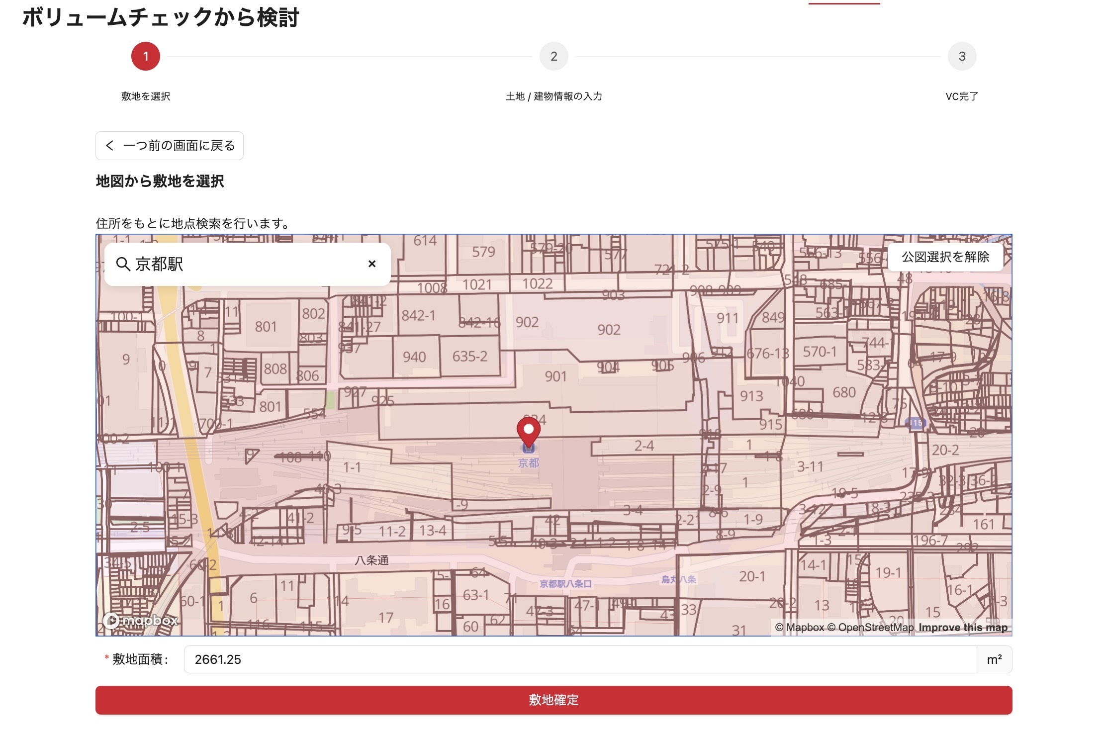 今回、行われたリリースにより、地図から地番を選択して敷地を設定し、最短1分で完了するボリュームチェックの体験を京都市、名古屋市、福岡市にも範囲を拡大し提供可能になりました。