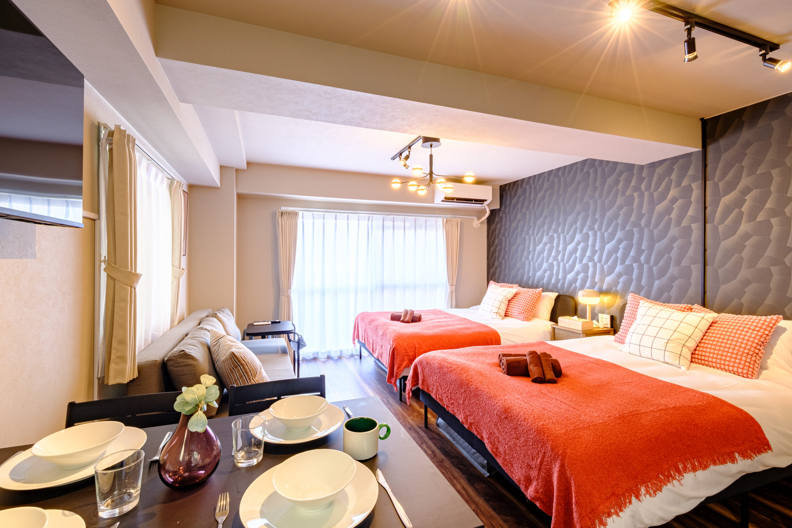 ゆとりのあるワンルームにはダブルベッド2台に加えて、ソファベッド1台をご用意しておりますので、ご宿泊の人数に合わせてご利用いただけるお部屋となっております。