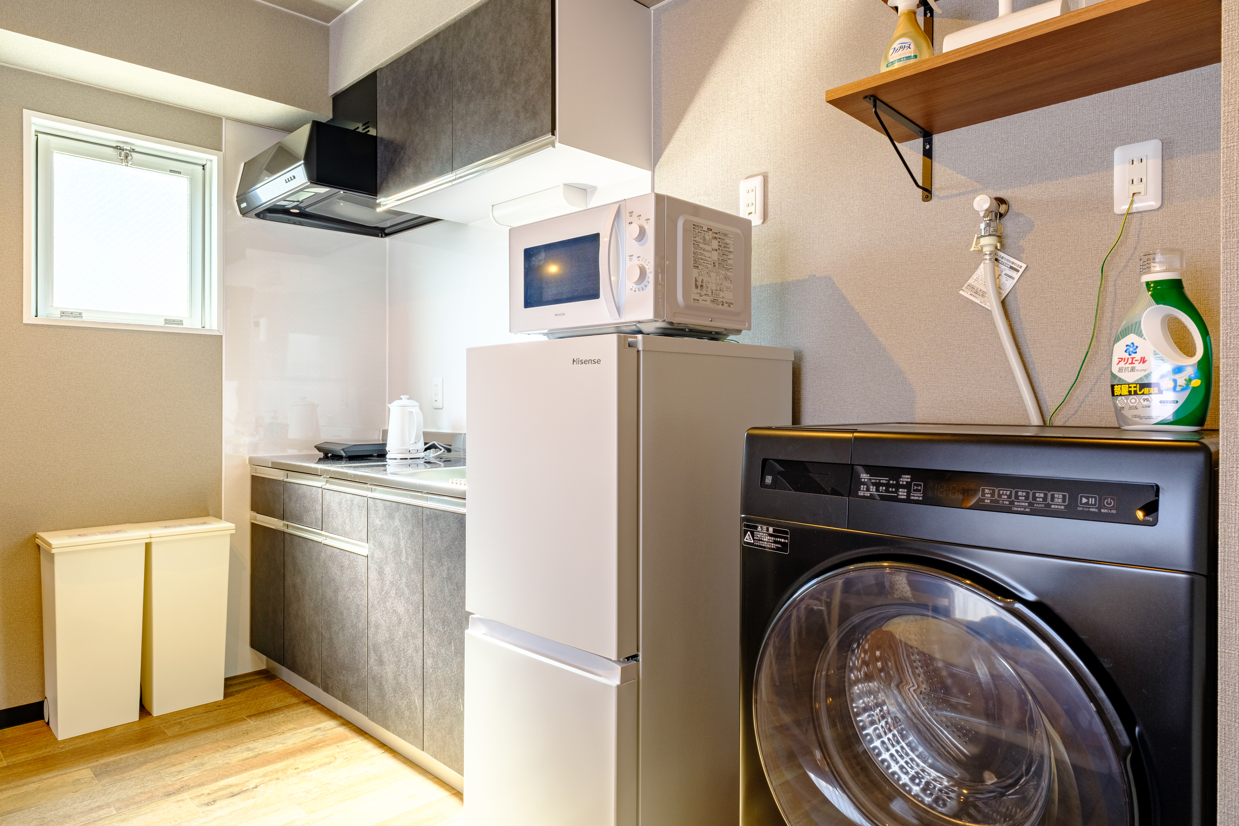 各種キッチン設備のほかにも、冷蔵庫や乾燥機付き洗濯機もご用意。