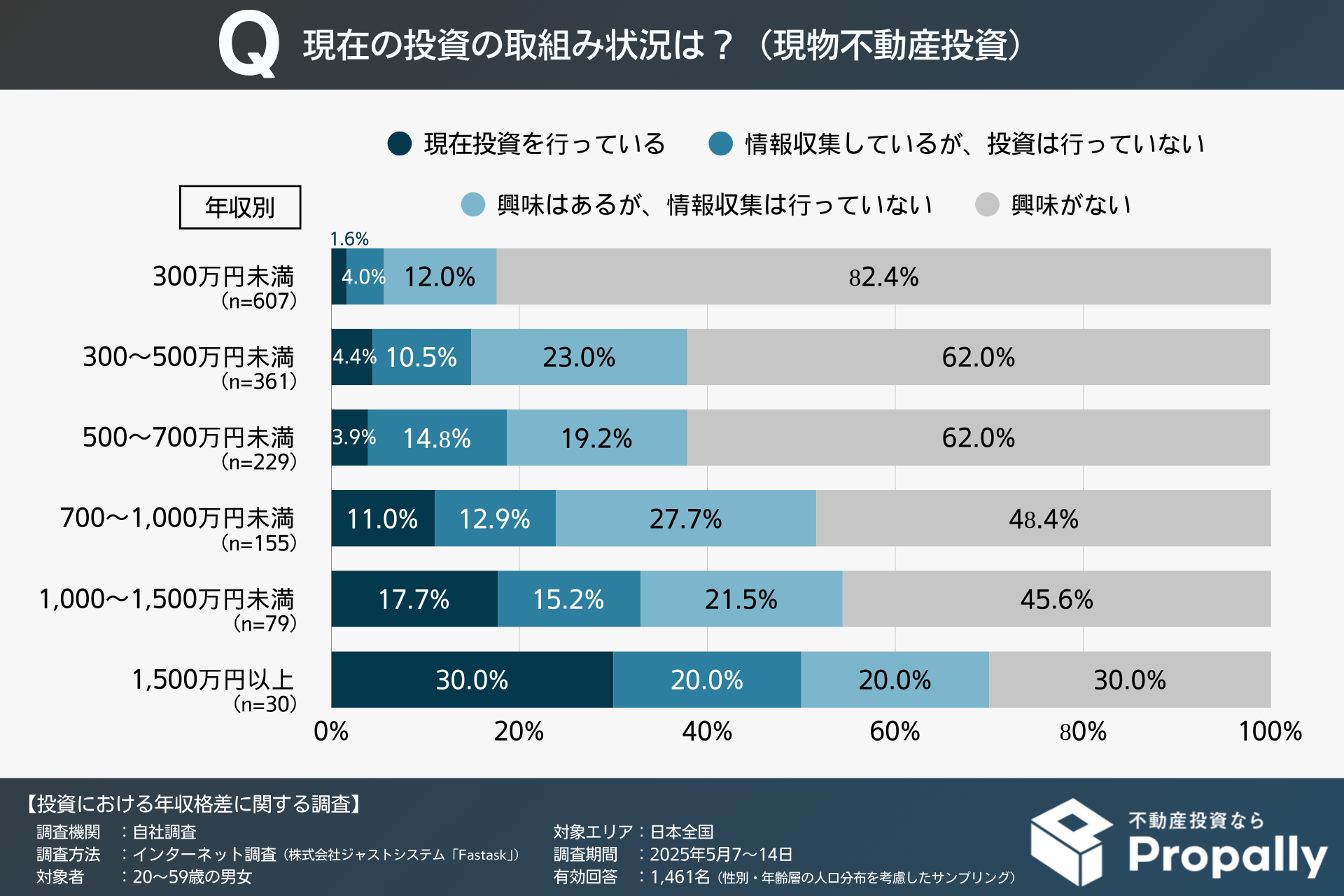 1.年収1,500万円以上の30.0%が現物不動産投資を実施、年収300万円未満はわずか1.6%