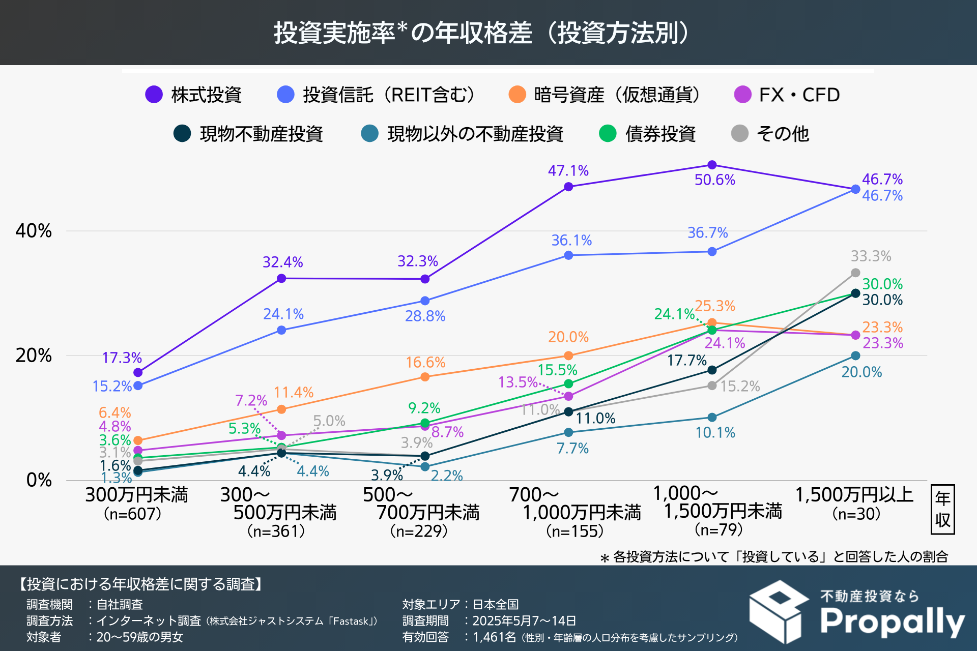 現物不動産投資の実施率は年収による格差が最も大きく、他の投資手法よりも大きな開きがある