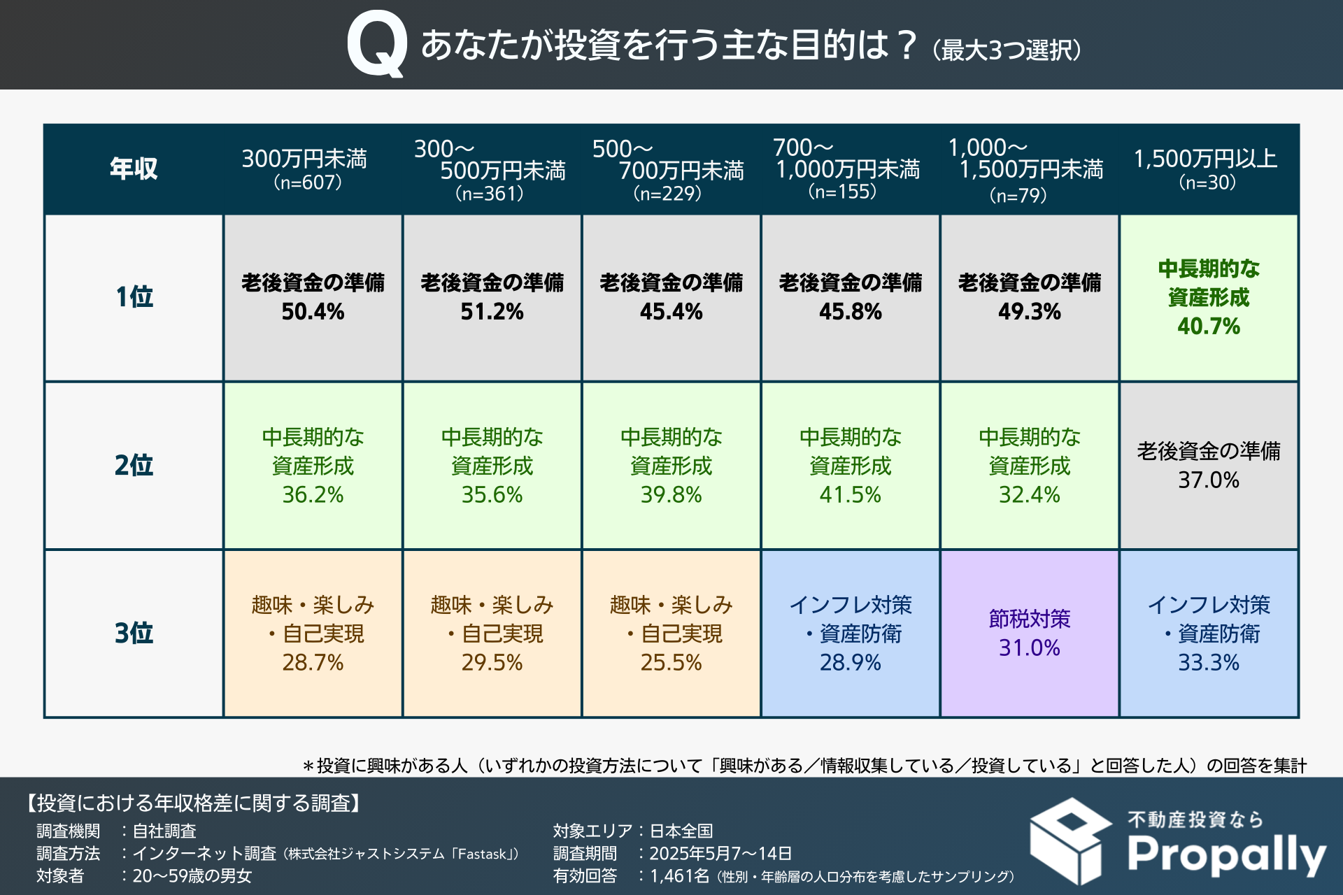 全ての年収層で老後資金準備が投資における重要な目的だが、高所得層では節税対策や資産防衛など戦略的な目的も重視されるようになる