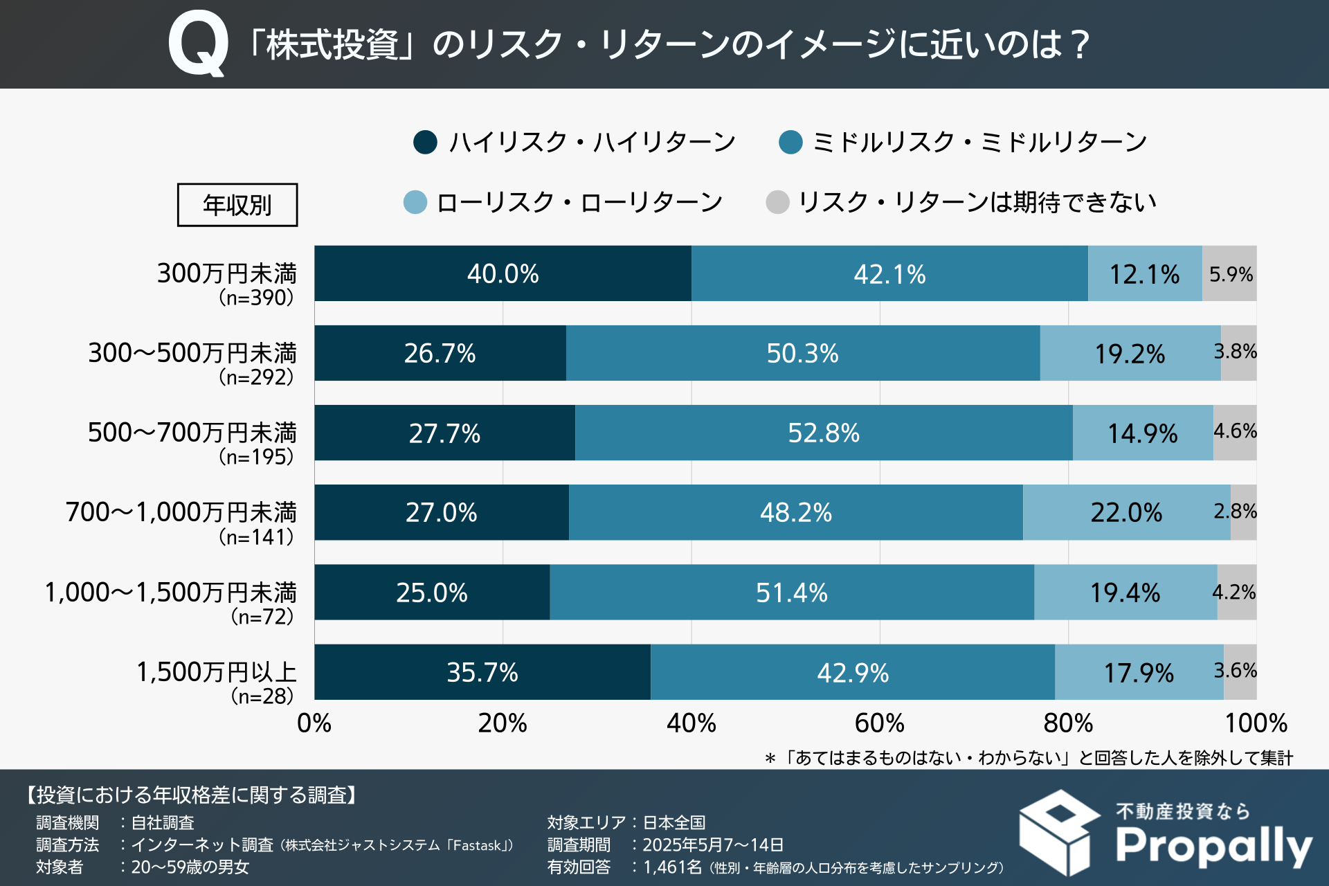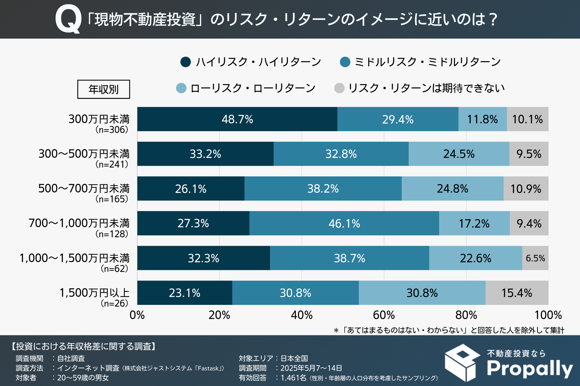 年収300万円未満の層では、現物不動産投資を「ハイリスク・ハイリターン」と認識する割合は48.7%、株式投資では40.0%となってます。この層は投資に対して高いリスク認識を持つ傾向が見られますが、特に現物不動産投資への警戒感が強いことがわかります。