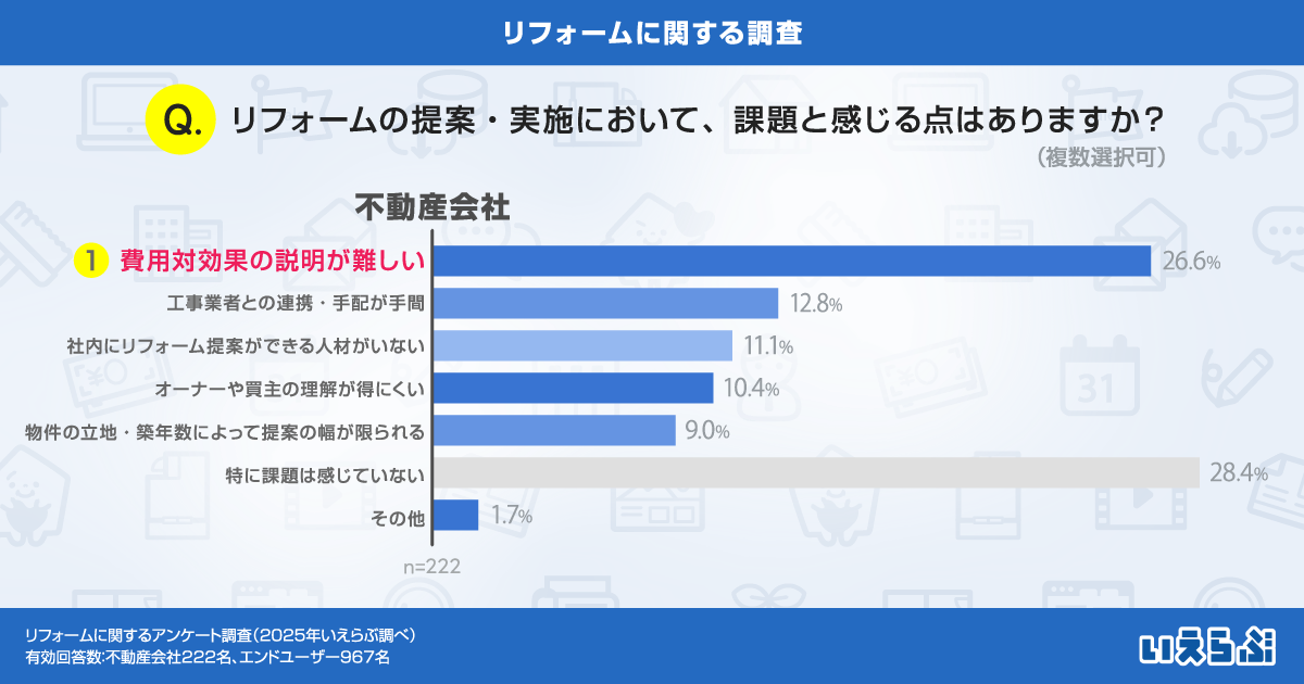 一方で、不動産会社側からも「費用対効果の説明が難しい」(26.6%)や「社内にリフォーム提案ができる人材がいない」(11.1%)といった課題が挙げられました。エンドユーザーと不動産会社の双方に、価格に関する情報不足が共通の悩みとなっている実態が明らかになりました。