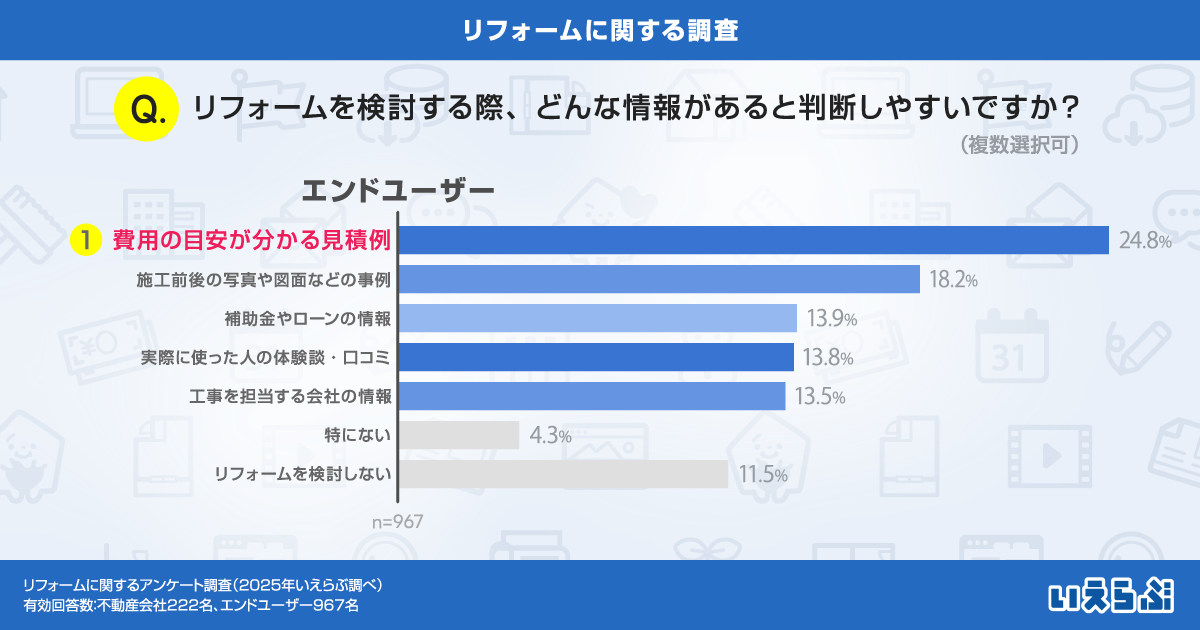 エンドユーザーに「リフォームを検討する際、どんな情報があると判断しやすいですか?」という質問をしたところ、「費用の目安が分かる見積例」(24.8%)が最も多く、次いで「施工前後の写真や図面などの事例」(18.2%)、「実際に使った人の体験談・口コミ」(13.8%)となりました。