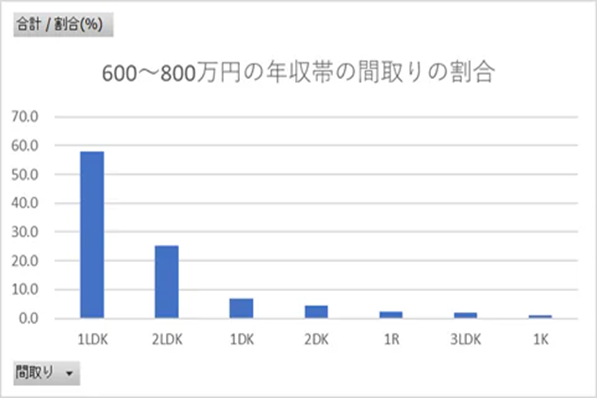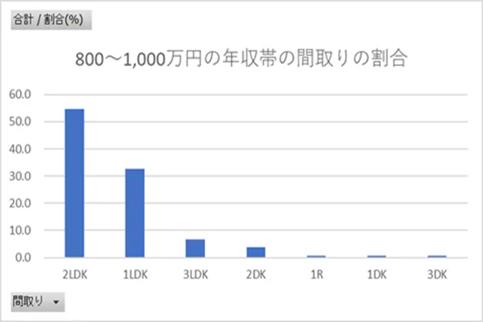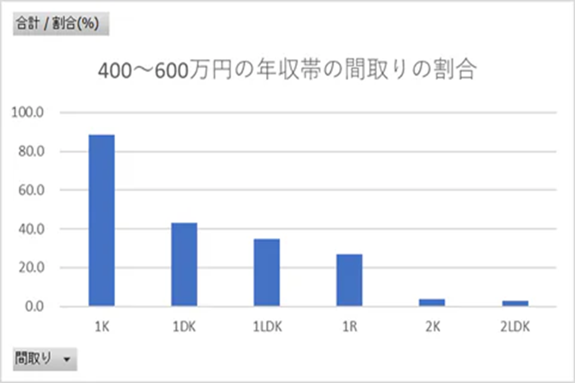 実際の成約データをもとに、全年収帯の間取り別の成約割合を以下にまとめました。1R・1K・1DK・1LDKの成約が約76%と非常に多いため、都心エリアで賃貸物件を探しているメインのユーザーは単身者や二人暮らしのカップル・夫婦という事が分かります。