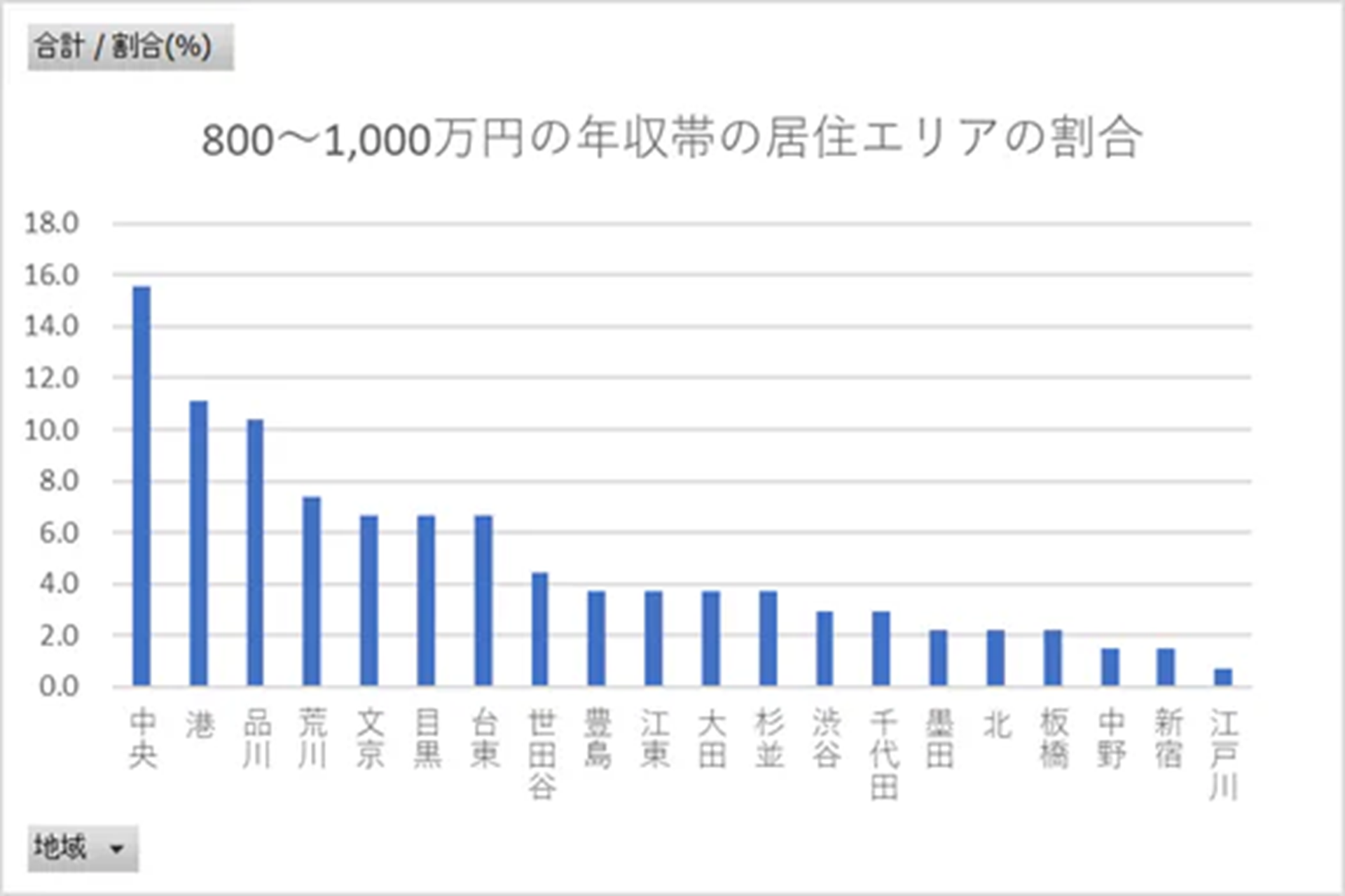年収800~1,000万円になると、選ばれる地域の傾向は一段と「都心プレミアムエリア」寄りになります。中央区・港区・目黒区・文京区での成約割合が高くなり、1LDKや2LDKを中心に22~28万円の賃料帯を許容する層が増えてきます。