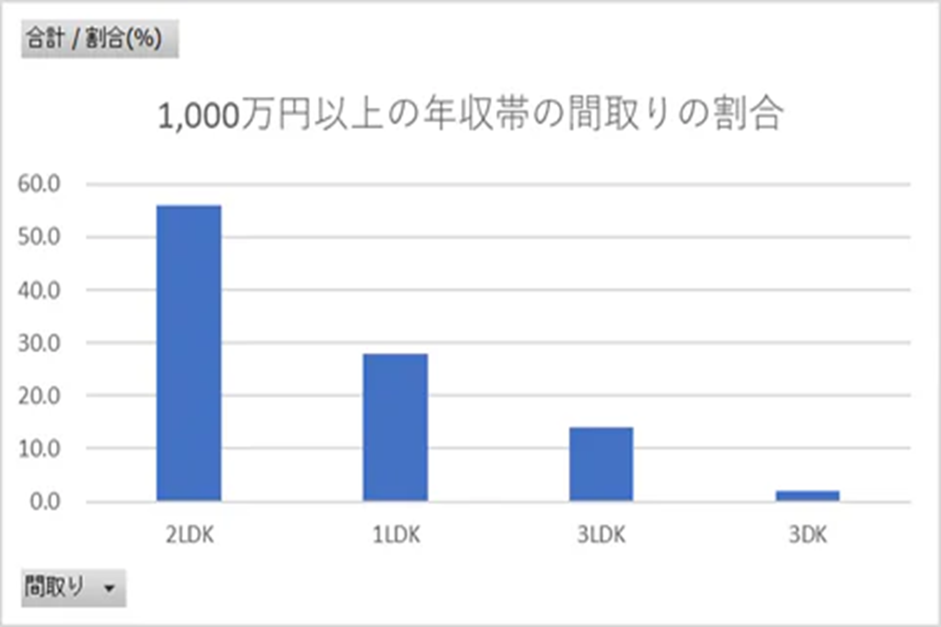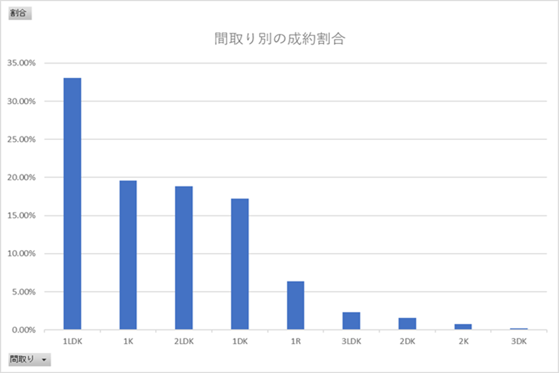 1Rは単身者向けの間取りであるにも関わらず成約割合6.38%と数字が低いのは室内にキッチンがある事が忌避されており、特に料理をする事の多い女性からは不人気です。1Rの成約者の殆どは男性となっている事に加えてマンション開発会社もニーズが低いことが分かっているため1Rの住戸を作らない事が多く、その結果が成約割合に表れています。