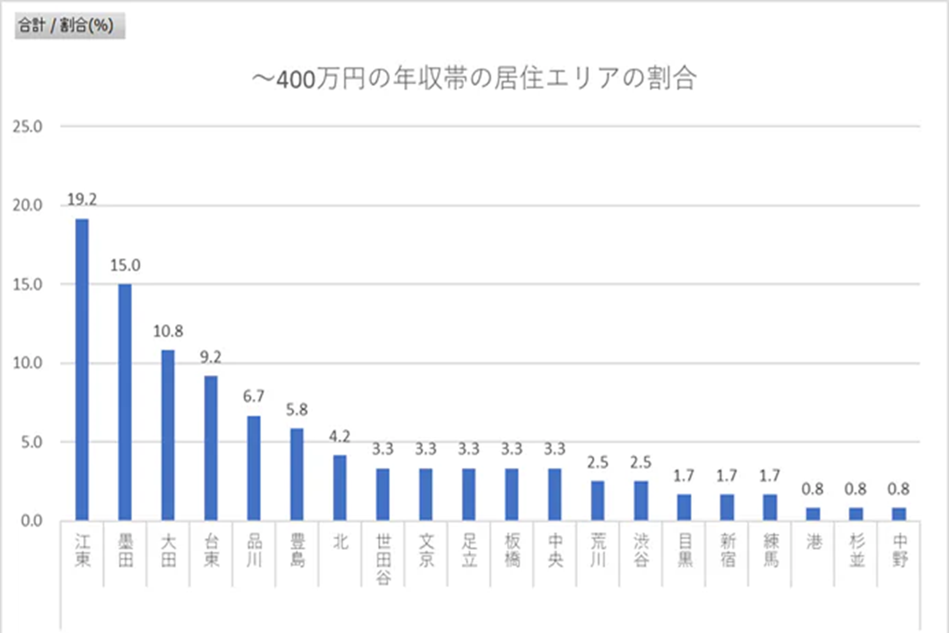 年収400万円までの層の成約が多いのは江東区・墨田区・大田区・台東区など、比較的家賃を抑えやすく、かつ交通アクセスの良い地域です。例えば江東区なら都心へのアクセスが良好な東西線や半蔵門線沿線にコンパクトな1Kや1Rが多く、通勤時間を抑えながらも家賃10万円前後に収められる物件が選ばれています。