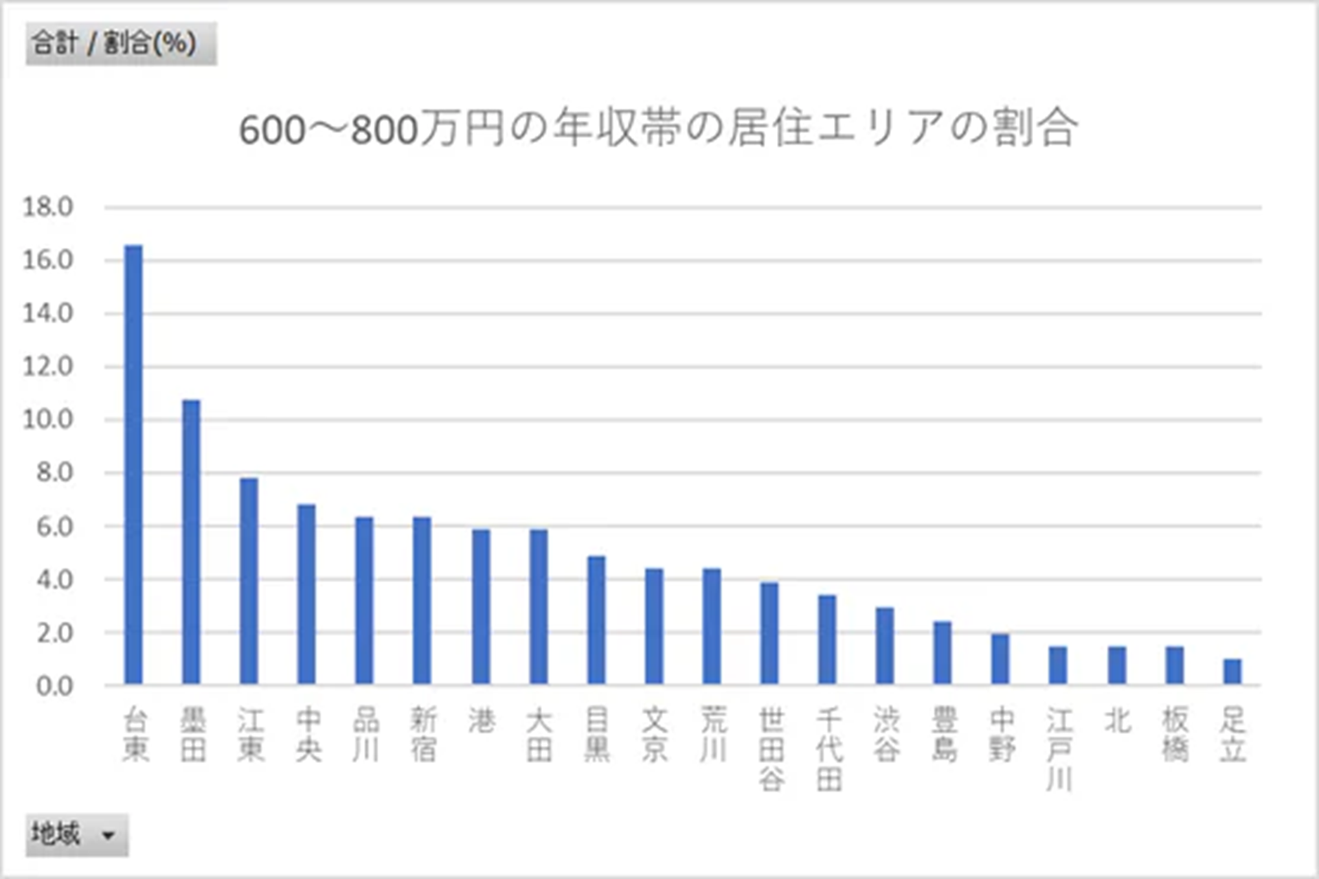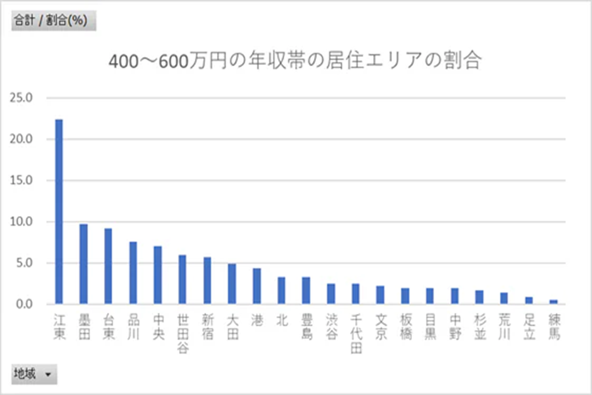 年収400~600万円の層になると、成約割合が最も高いのは江東区・墨田区・台東区・品川区といった「都心隣接エリア」です。賃料相場は1Kで10万〜13万円台、1LDKでも15~17万円前後が中心で、東京メトロやJRでの主要エリアへのアクセスを確保しつつ、生活利便性の高いエリアが選ばれます。