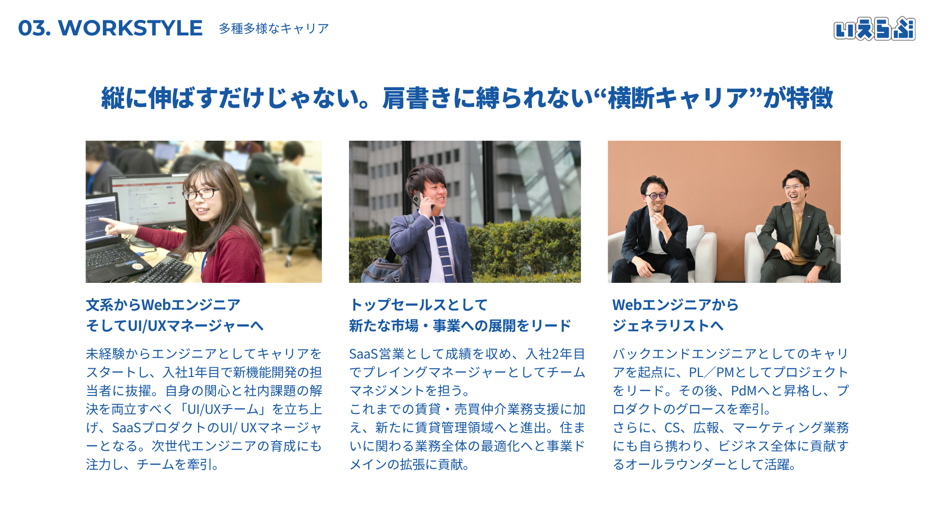 FOCUS 1:いえらぶの「人」と「カルチャー」 社員インタビューや【1日のスケジュール例】や【社内イベントの紹介】などを通して、当社で働くメンバーのリアルな声や、チームワークを重視する社風をお伝えします。