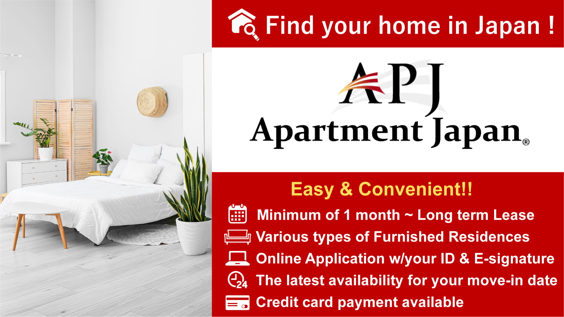 A foreigner-friendly rental housing platform specializing in mid- to long-term stays in Japan. Apartment Japan provides flexible solutions for foreigners facing challenges when seeking housing in Japan, offering full support tailored to their length and purpose of stay.