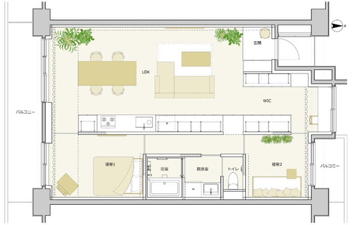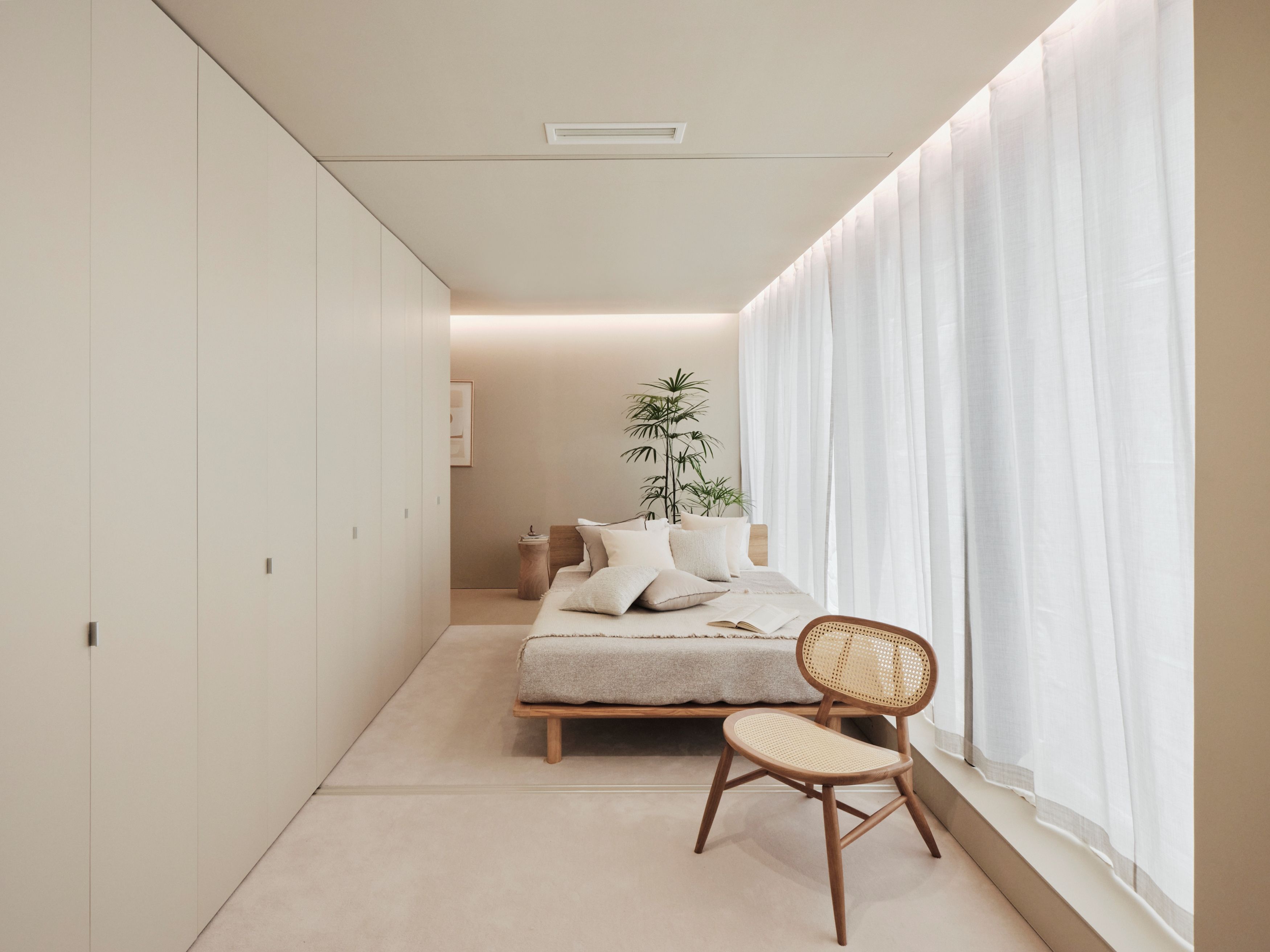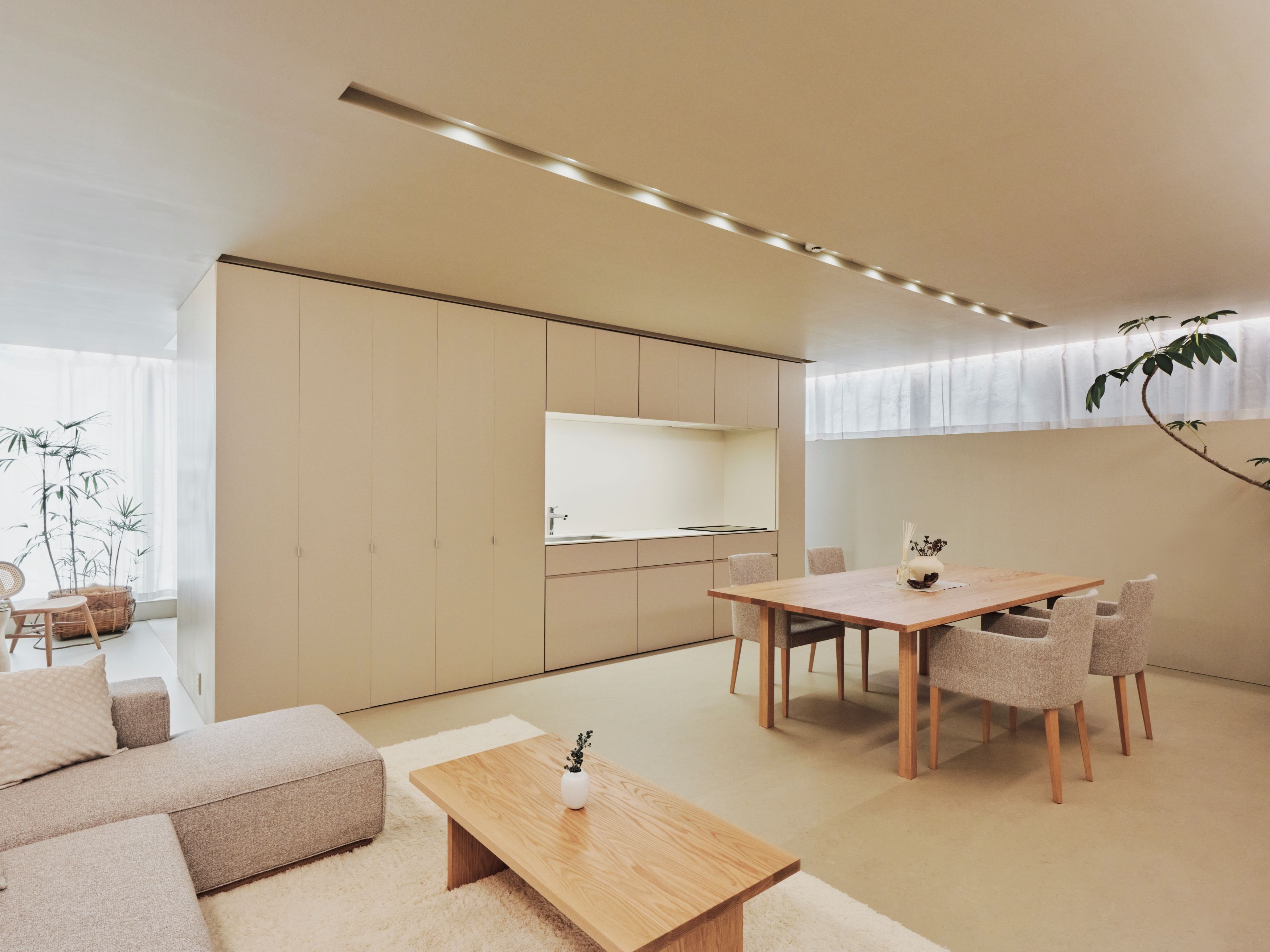 MUJI INFILL 0の特長である、家具や建具の配置によって、可変性があり、光と風をよく通す空間を「MUJI INFILL FLAT」でも取り入れています。収納や水廻りでゆるやかに仕切ることで、ひとつながりの空間に「心地よい距離感」をうみだします。