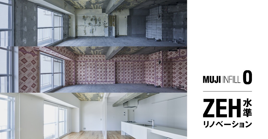 無印良品のリノベーションでは、2015年のMUJI INFILL ZERO発売以来、性能にこだわり高い基準でマンションリノベーションをし続けております。永く安心して住んでいただけるように、リノベーションの施工対象を新耐震基準のマンション・団地に限定し、フルスケルトンにして躯体やサッシなどの共用部分以外を作り直し、高性能断熱材やインナーサッシを用いて温熱環境を整えてきました。また、2024年1月より、高断熱・高気密の住まいを求めるニーズに応えるため、断熱性能等級5、一次エネルギー消費量等級6と国内最高水準のリノベーション「MUJI INFILL 0 ZEH水準リノベーション」をリリースいたしました。