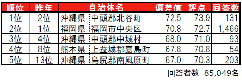 熊本県熊本市のベッドタウンの上益城郡嘉島町(昨年8位)、沖縄県那覇市のベッドタウンの島尻郡南風原町(昨年13位)など、各県都市部のベッドタウンとして発展している郡部に属する「町」が、昨年より大きく順位を上げて新たにトップ5入りしています。