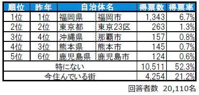 6年連続で、福岡県福岡市が1位に輝きました。2位は4年連続で東京23区、3位は昨年4位から順位を上げた沖縄県那覇市です。4位は熊本県熊本市、5位は鹿児島県鹿児島市という結果になっています。
