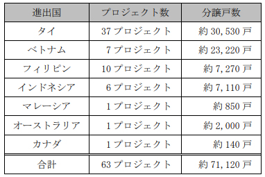 当社では現在ASEAN諸国を中心に海外における不動産事業を強化すべく、さまざまな取組を進めています。そのうち住宅分譲事業は、これらのプロジェクトへの参画により総計63プロジェクト(約71,120戸)となります。