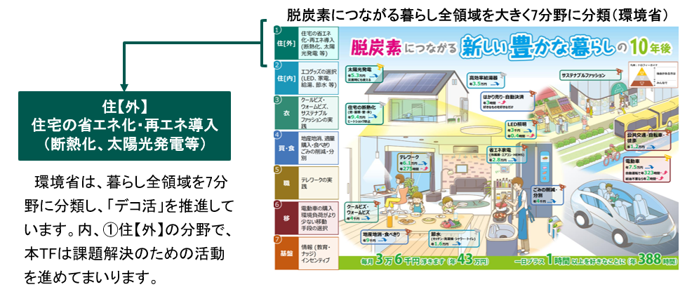 本TFは、環境省が推進する「デコ活」(脱炭素につながる新しい豊かな暮らしを創る国民運動)の一環で、既存住宅の断熱・省エネリフォームに関わる上記企業・団体が結集し、連携強化と普及促進を目的として設立いたしました。
