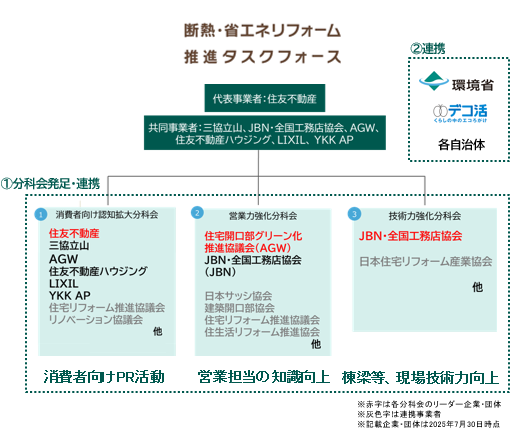 この度、住友不動産株式会社を代表事業者とし、三協立山株式会社、JBN・全国工務店協会、住宅開口部グリーン化推進協議会(以下「AGW」)、住友不動産ハウジング株式会社、株式会社LIXIL、YKK AP株式会社と連携しまして、断熱・省エネリフォーム推進タスクフォース(以下「本TF」)を発足しましたのでお知らせいたします。(代表事業者以外、五十音順)
