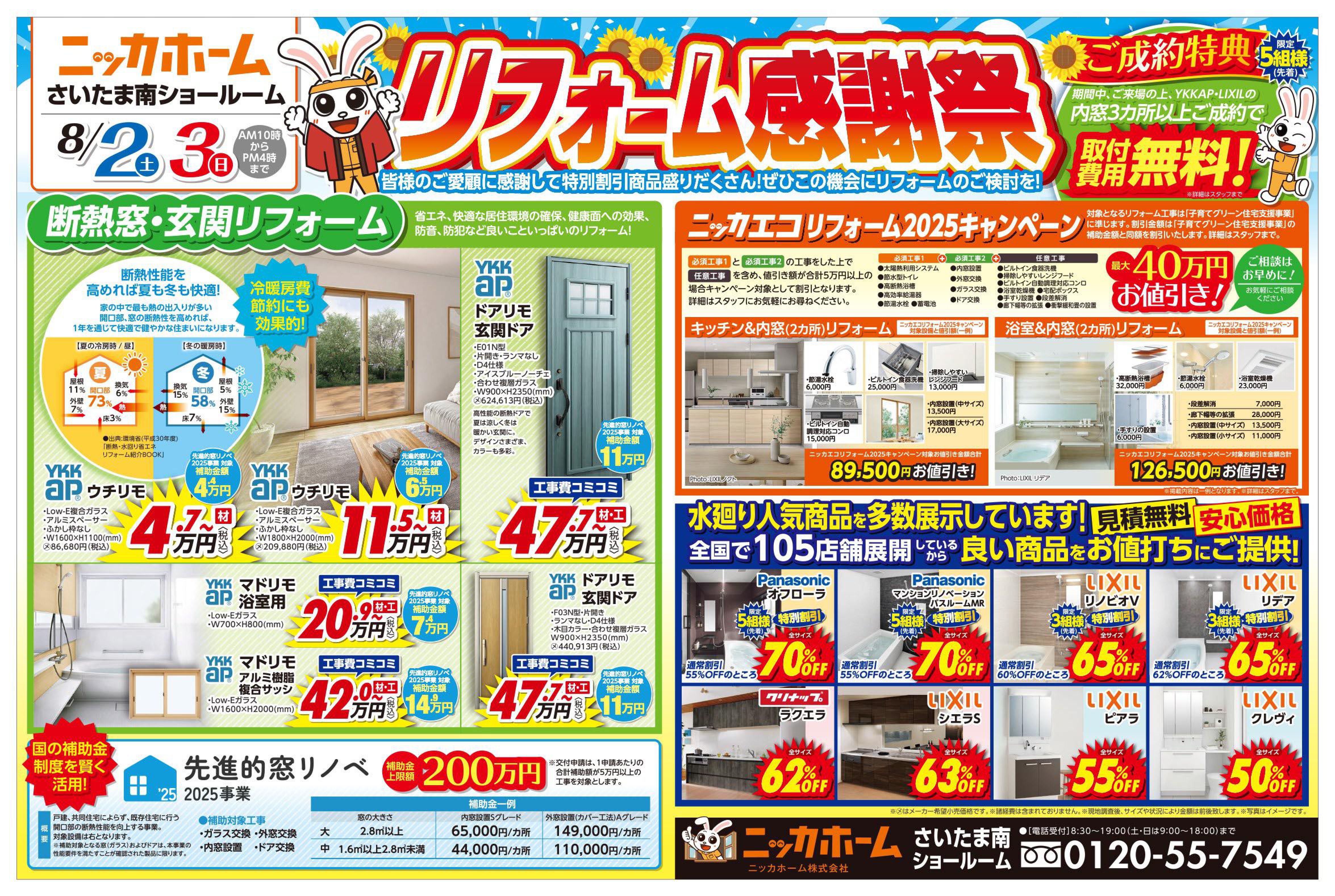 地域の皆さまのご愛顧に感謝し特典を盛りだくさん用意しました!25年8月2日(土)・3日(日)の2日間は、ニッカホームさいたま南ショールームでお待ちしております!