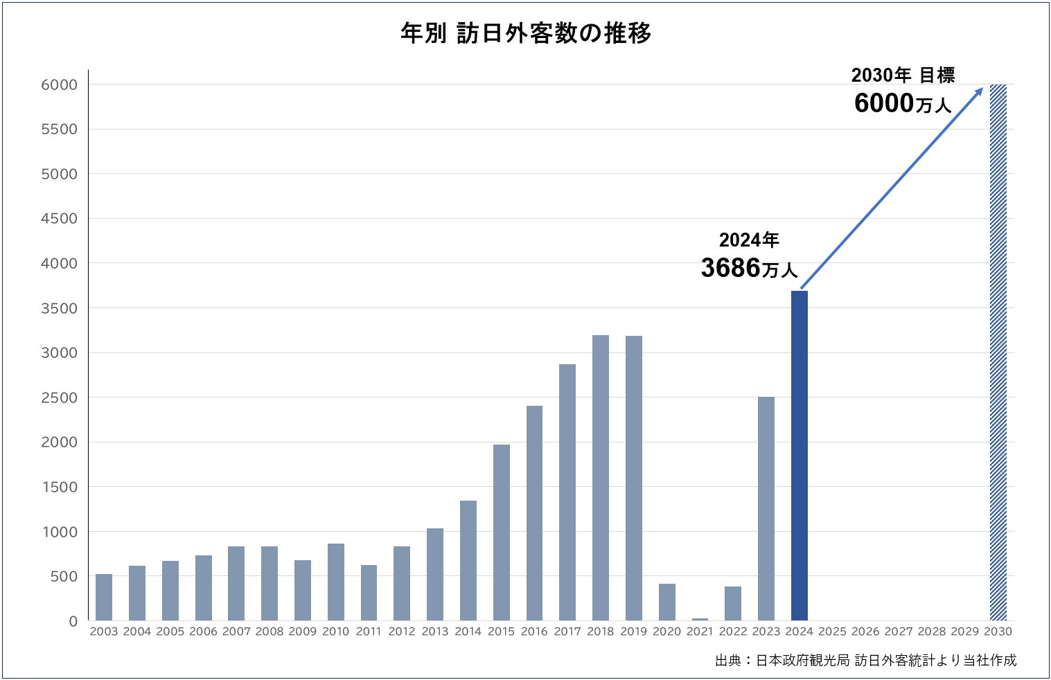 訪日外国人旅行者数は、コロナ禍を経て急速に回復し、2025年現在ではパンデミック前の水準を上回る勢いで推移しています。政府は2030年までに年間6,000万人の訪日客誘致を目標に掲げており、インバウンド市場は今後も継続的な成長が見込まれます。