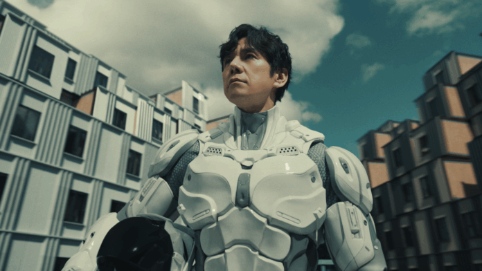 空を切るように進み、重厚な建物の屋上に降り立つその姿は…ダイワマン。