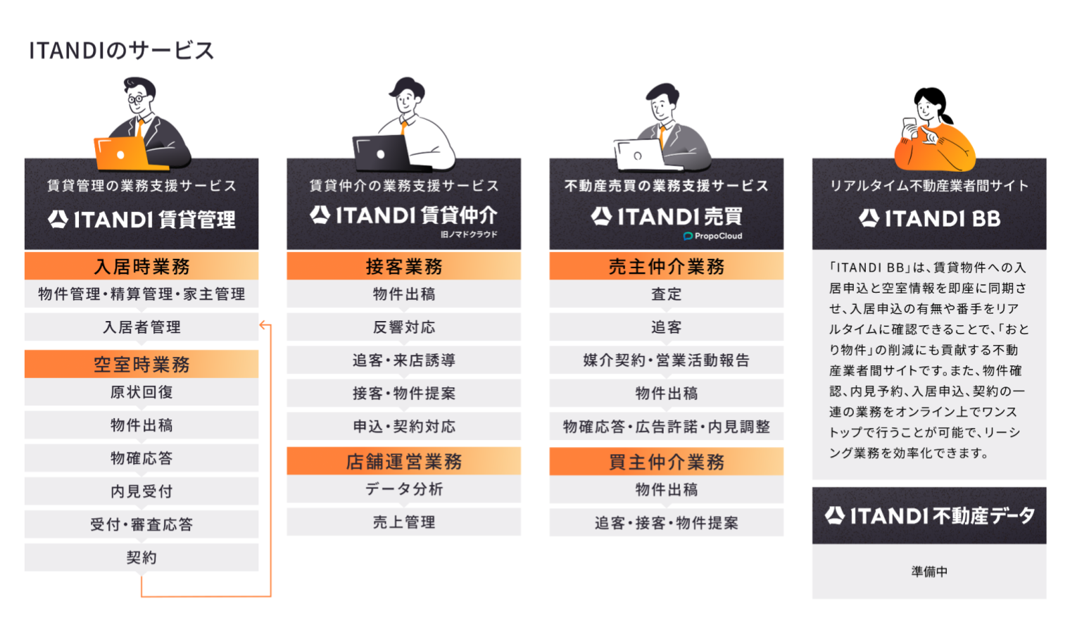 不動産賃貸・売買の取引における一連の業務をDXするサービスを提供しています。不動産賃貸領域ではリアルタイム不動産業者間サイト「ITANDI BB」のほか、「ITANDI BB」と連携する賃貸管理の業務支援サービス「ITANDI 賃貸管理」や、賃貸仲介の営業支援サービス「ITANDI 賃貸仲介(旧「ノマドクラウド」)を展開。不動産売買領域では不動産売買仲介会社向け営業支援サービス「ITANDI 売買 PropoCloud」を展開し、それぞれの領域でなめらかな業務体験と取引体験を実現しています。