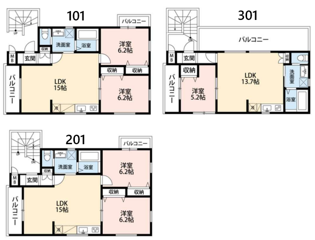 全3室はいずれも1LDKおよび2LDKの広めの間取りを採用しており、ワンルーム型が多い周辺エリアにおいては希少なファミリー・グループ対応型物件です。