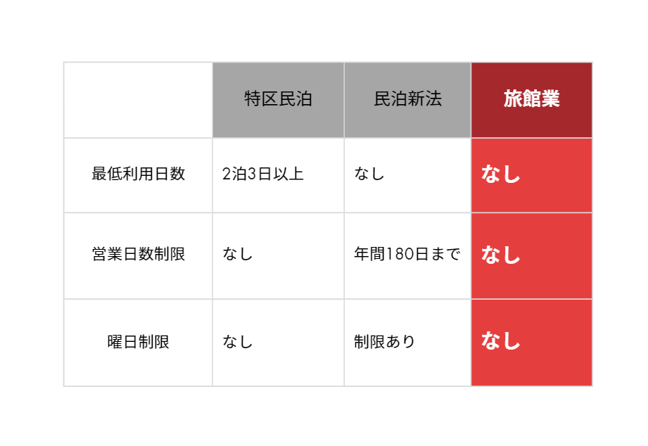 本物件は、旅館業法に基づく正規の許可運営を前提としており、民泊新法や特区民泊と異なり、営業日数・曜日・宿泊期間に関する制限が一切ありません。