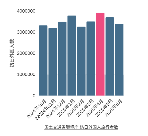 コロナ収束後、インバウンド市場は急速に回復し、特にアジア圏・欧米圏からの訪日客数が大きく増加しています。2025年4月には訪日外国人数が390万人を突破し、過去最高を更新。その後も勢いは衰えず、**6月には337万人超(前年同月比+7.6%)**となり、2か月連続で記録を塗り替えました。
