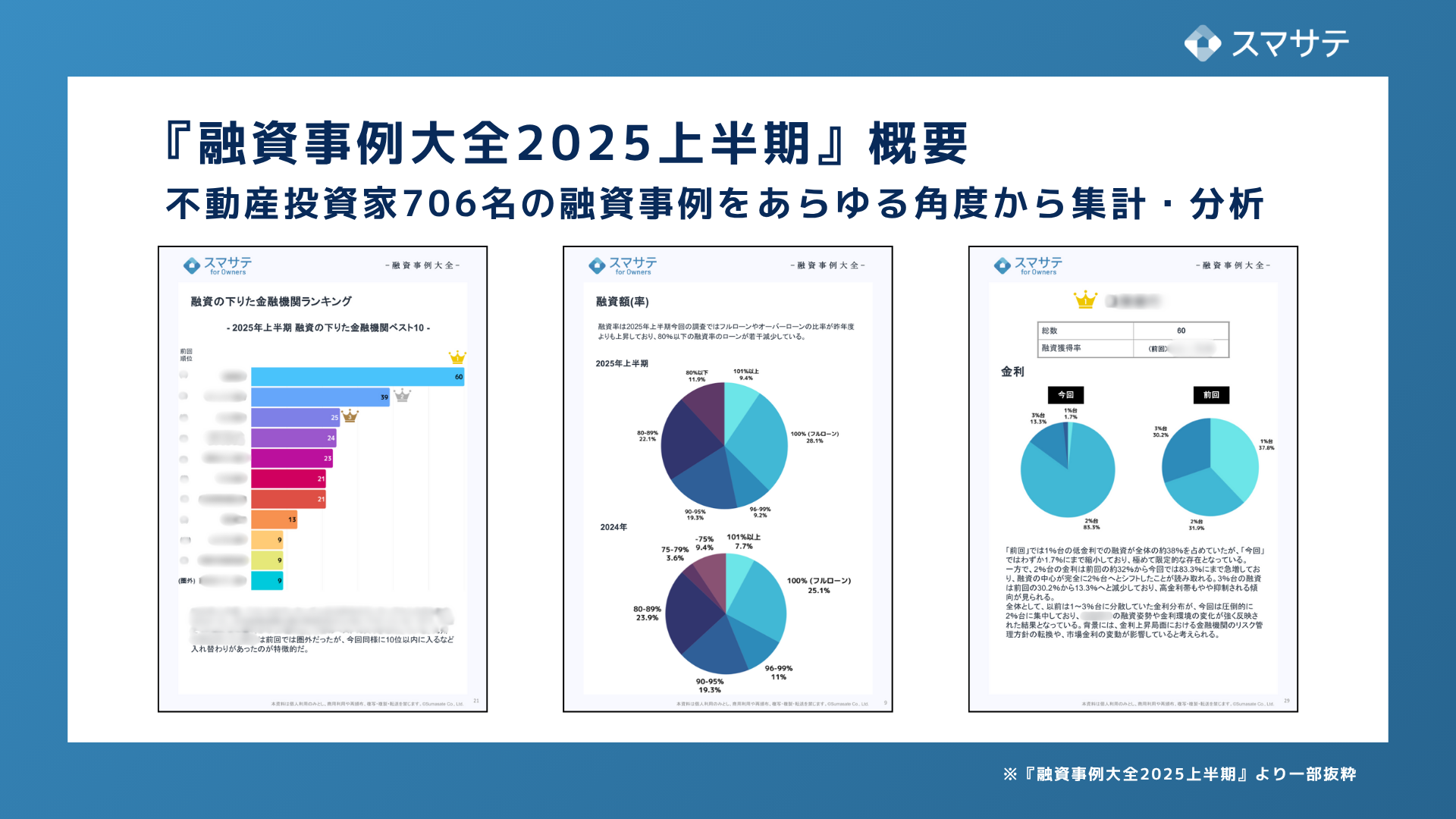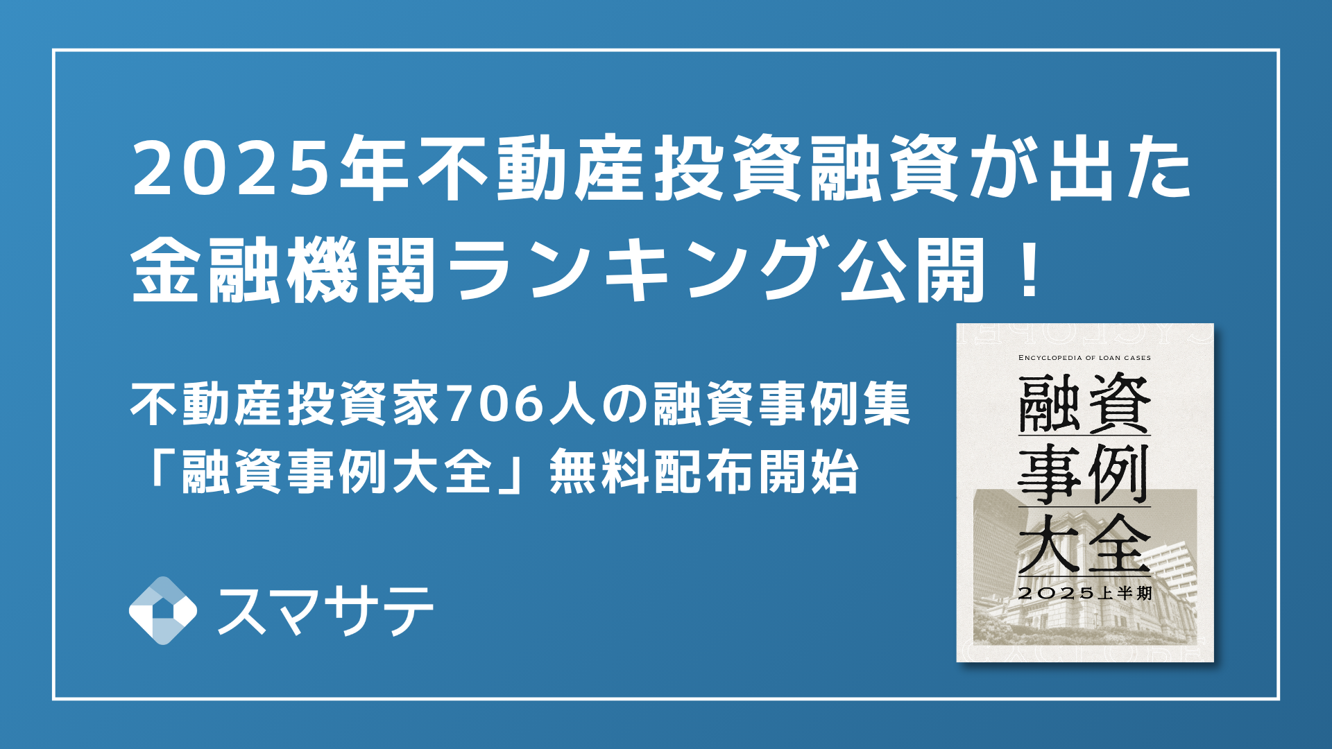 不動産会社向けAI賃料査定システム「スマサテ」および、不動産個人投資家向けAI家賃査定ツール「スマサテ for Owners」を提供するスマサテ株式会社(本社:東京都品川区、代表取締役社長:山岸 延好)は、不動産投資家706人の融資事例をまとめた資料「融資事例大全2025上半期」を個人不動産投資家と不動産会社向けに無料配布を開始しました。