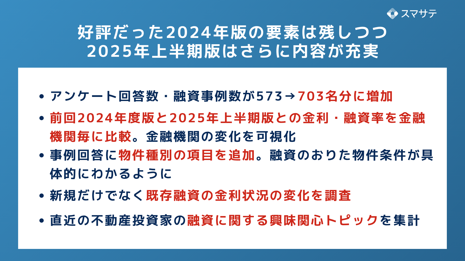 スマサテでは、こうした情報の可視化を目的に、2024年末に不動産投資家573名を対象としたアンケートを実施し、「融資事例大全2024」を制作、その信頼性の高い分析と充実した内容が高く評価されました。この大きな反響を受け、さらなる情報の充実を図った「融資事例大全2025年上半期」を新たに制作、不動産投資家および不動産会社へも配布を開始しました。