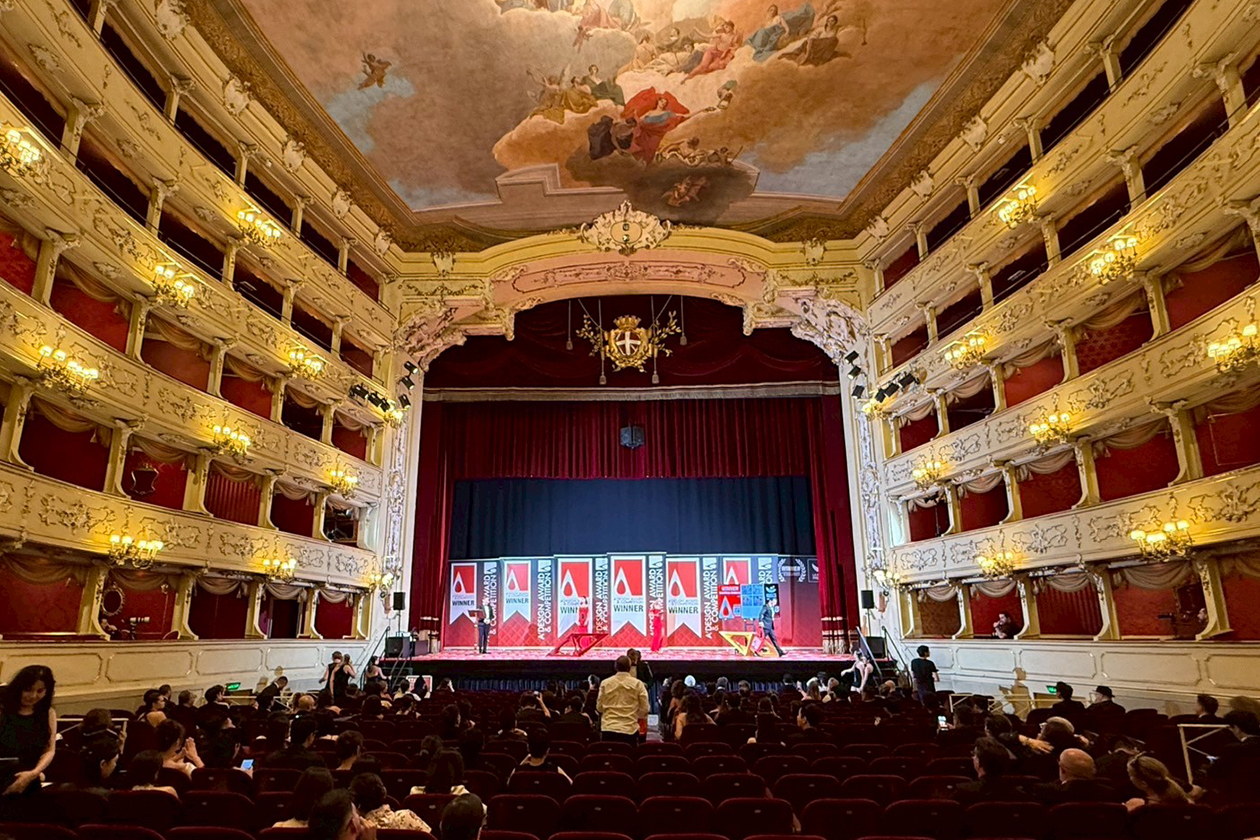 受賞式は2025年7月17日、歴史あるオペラ劇場 Teatro Sociale(テアトロ・ソシアーレ) にて開催され、世界中から選ばれたデザイナーたちとともにこの場に立てたことは、私たちにとってかけがえのない経験となりました。