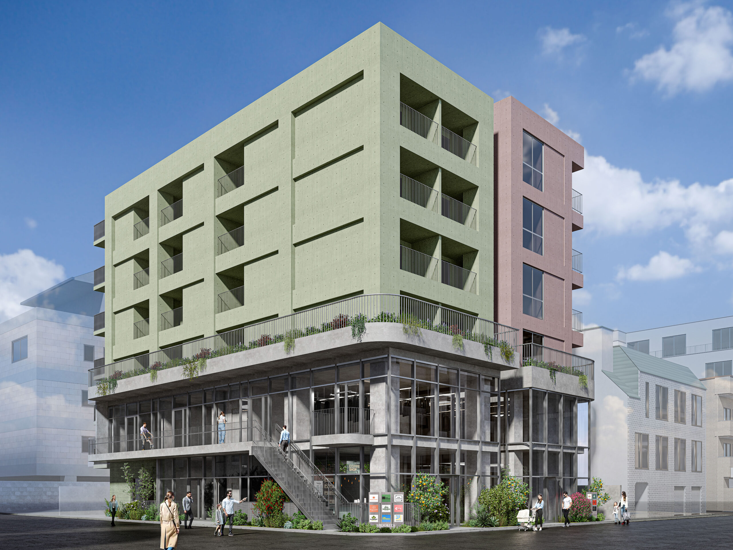 小さなスケールの建築が街並みを形成している「歩行者の街」下北沢に合わせ、全体のボリュームを縦に2つに分割し、街に馴染ませます。低層部は軽やかで浮遊感のあるガラスボックスとし、植栽帯を有効に配置することによって開かれた魅力的な商業スペースとします。高層部の外装は植物の緑と呼応する緑色、そして緑の補色関係となるピンク色の鮮やかな色彩を施し、個性的なキャラクターを与え、色彩が溢れるサブカルチャーと共に醸成してきた街並を体現しています。さらに、陰影を生む手触り感のあるテクスチャとし、経年を楽しむ外装となっています。今後、街と共に魅力的に時間を積み重ねここにしかない新しい街の風景となる集合住宅を目指します。