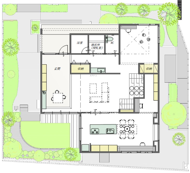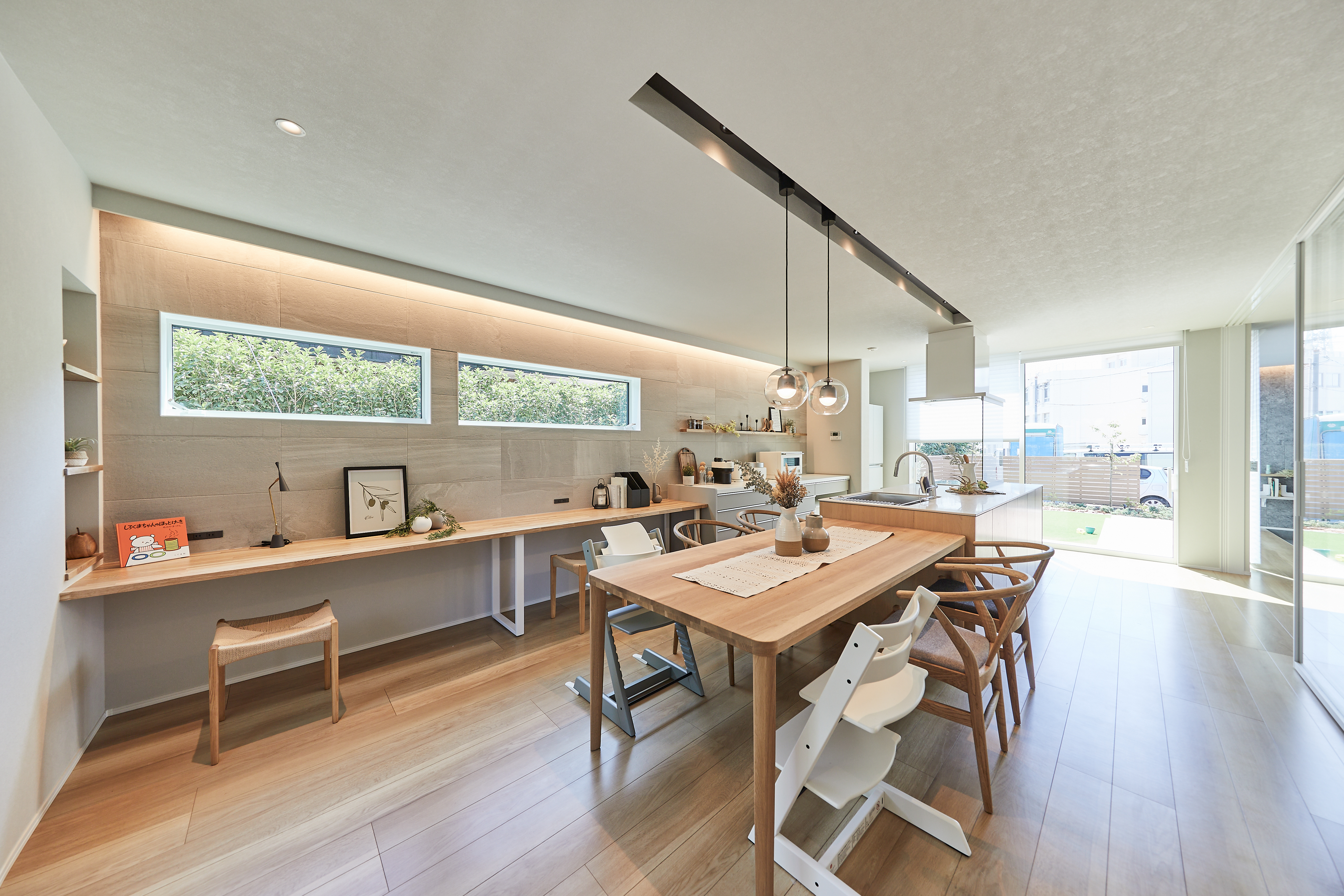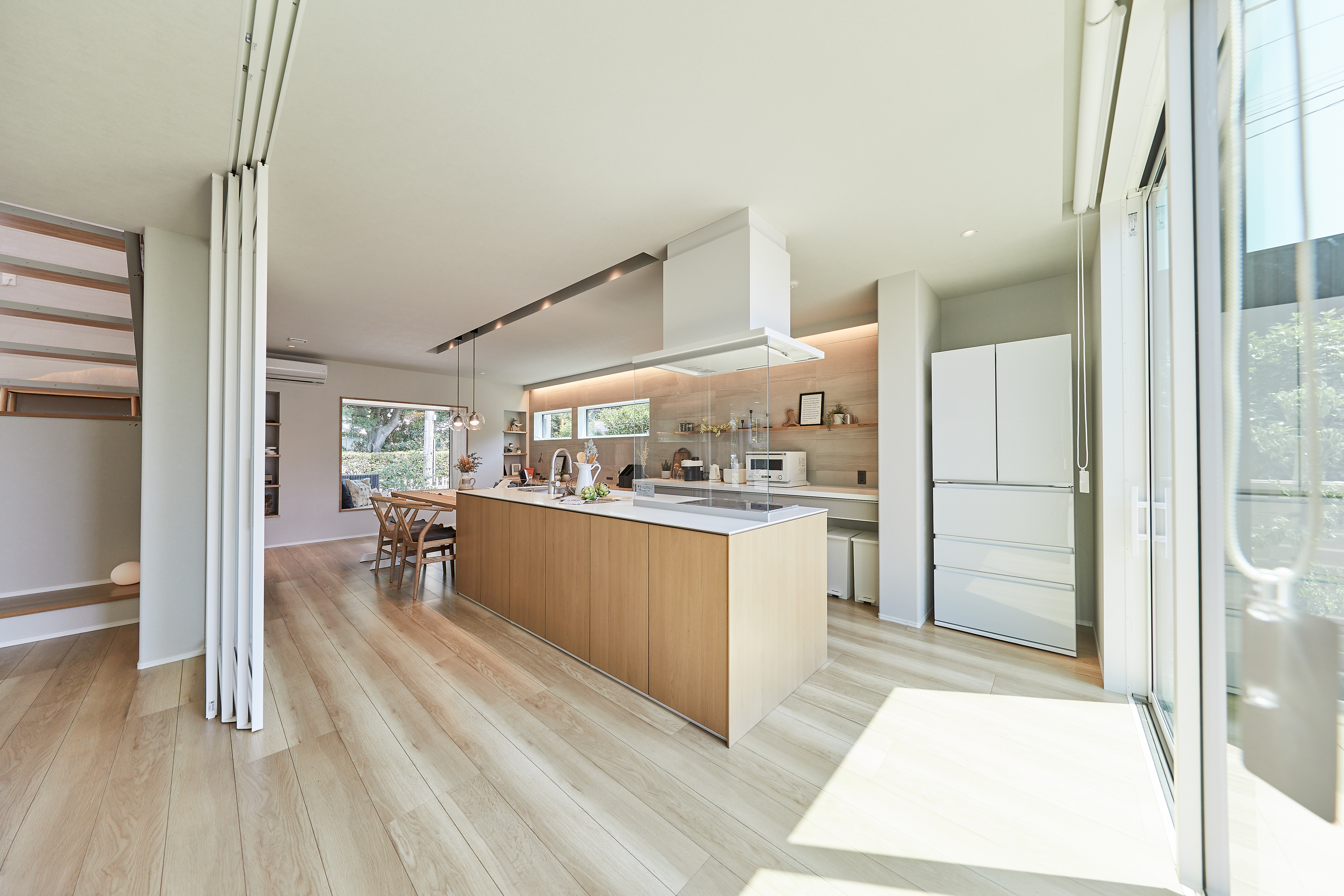 ③見守り動線:キッチンにいながら、リビングや庭を見守れる
