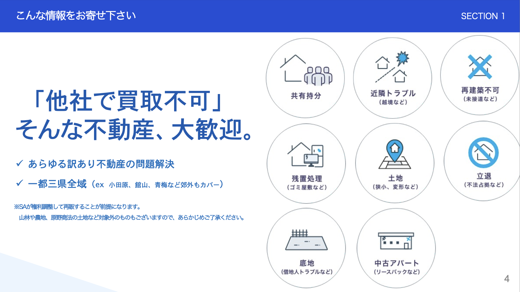 近年、全国で再建築不可や共有持分、底地といった「訳あり不動産」が増加傾向にあります。放置された空き家、相続による名義トラブル、未接道、境界未確定など、これらの物件には出口がなく、日々、次のような声がSAに寄せられています。