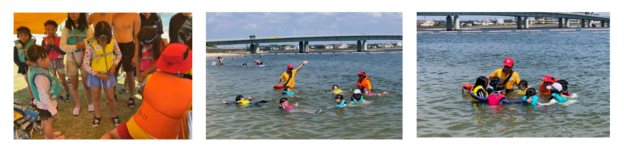 ビーチを訪れた家族連れを対象に、海に入る前の注意点や、保護者が子どもの水辺の事故を防ぐ方法、そして万が一の際の対処法について、説明と実演を通じて分かりやすく伝えました。