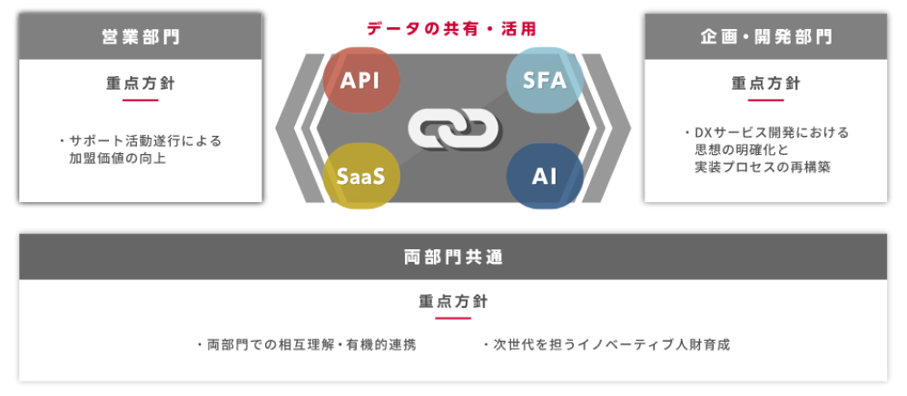 これらの貴重なデータを有効に活用し、加盟店の皆さまやエンドユーザーのニーズに迅速・的確にお応えするサービスをつくるため、DX戦略として営業部門と企画・開発部門が相互に連携する体制を構築いたしました。具体的には、加盟店情報・物件情報のAPIを用いたサービス間の連携、SFAツールやSaaSを用いた部門間の有機的なデータ共有および抽出を実現する業務改革に取り組んでいます。