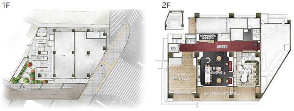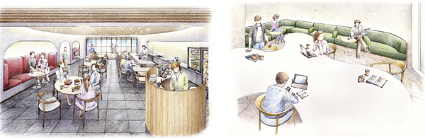 『イニシアグラン大分駅前』 ラウンジ「集(つどい)」イメージイラスト(左) ・ ラウンジ「間(ま)」イメージイラスト(右)
