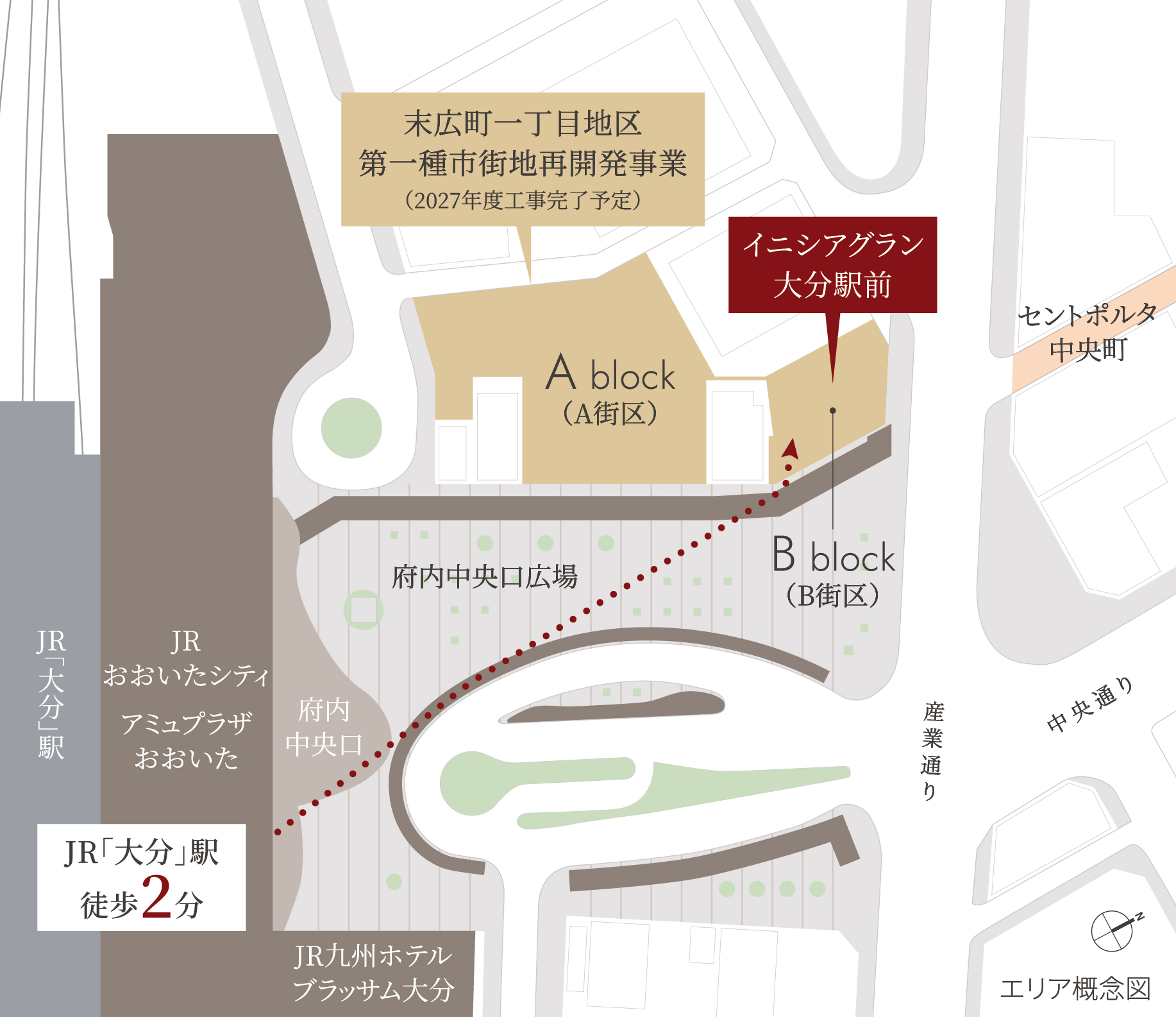 大分駅前再開発プロジェクトでは、JR大分駅北側エリアにおいて、土地の合理的かつ健全な高度利用および、都市機能の更新を図ることを目的に、市街地再開発事業によるまちづくりが進められています。JR「大分」駅府内中央口(北口)徒歩2分の地に商業施設・住宅・高齢者向け住宅が一体となった複合開発が計画されており、その開発エリアのB街区に『イニシアグラン大分駅前』が誕生いたします。本物件はプレシニア~シニア世代に向けて、万一に備え安心を提供する住まいに加え、上質かつ利便性の高い地域密着型の暮らしに繋がるプレミアムなサービスを展開し、ワンランク上の特別な日常を提供します。さらに、地元企業との双方の強みを活かした協業により、地域と密接に連携した安心・安全で暮らしやすいまちづくりに取り組み、持続可能な地域社会に向けた発展への貢献をめざします。