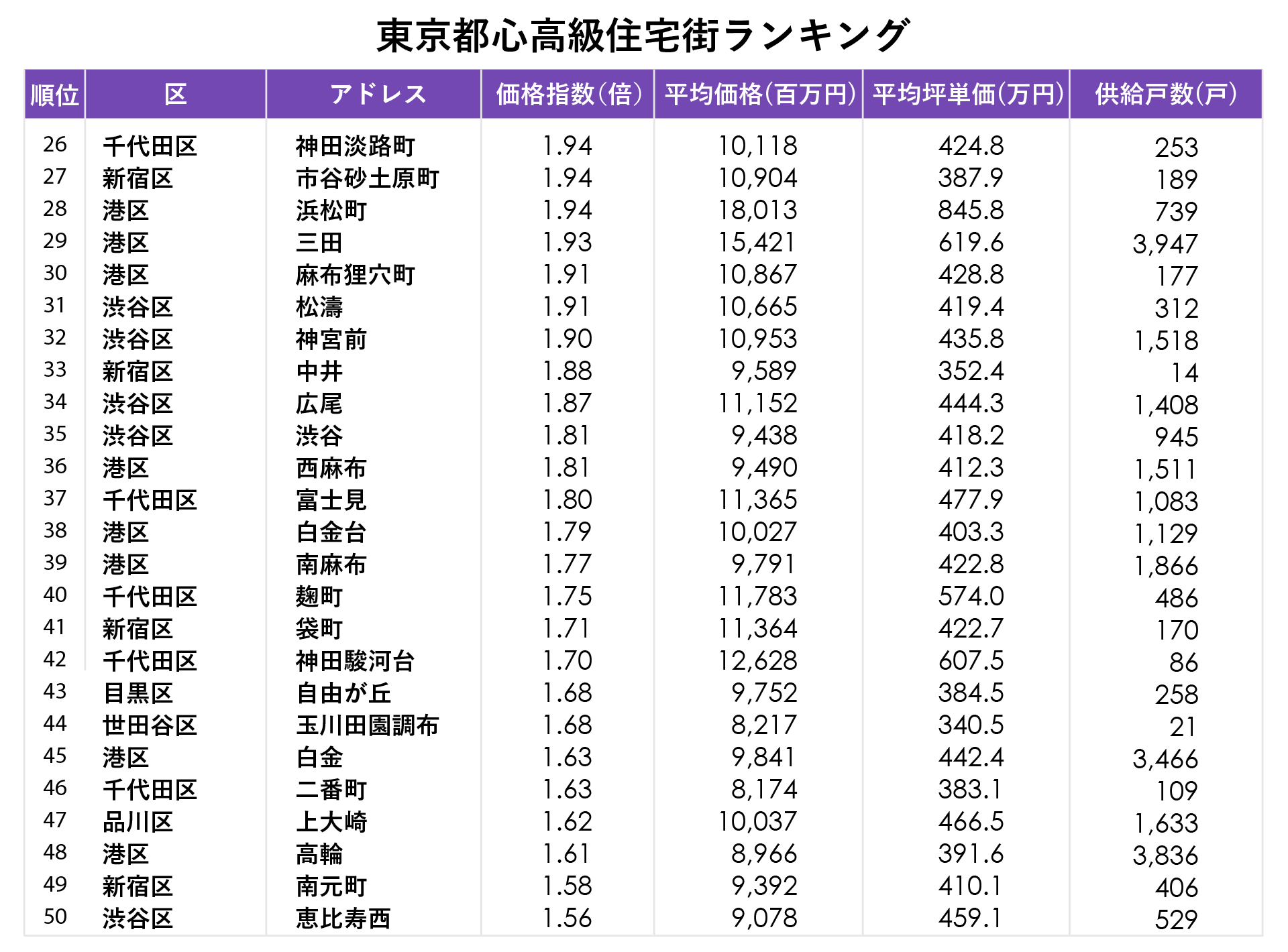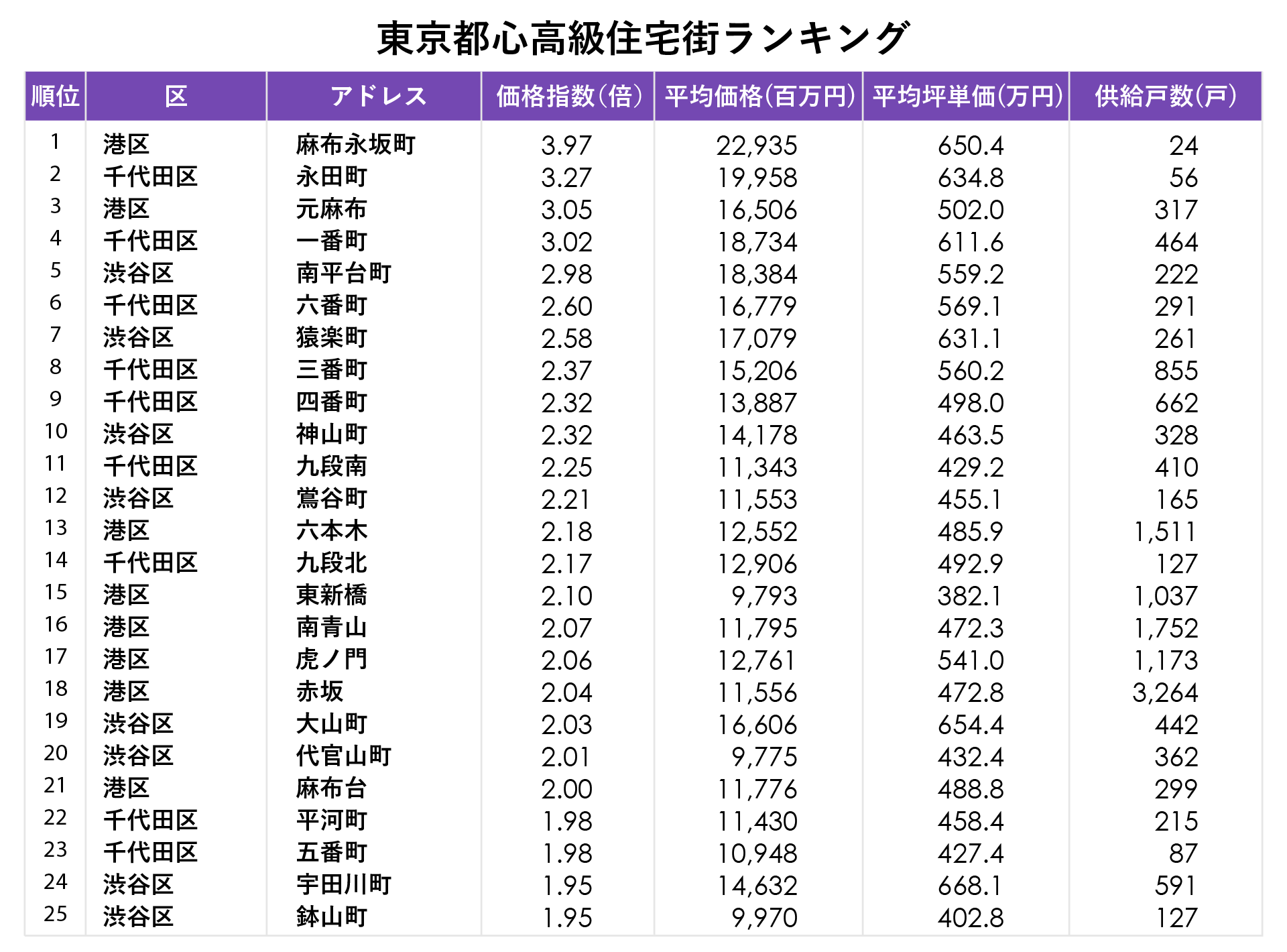 ランキング上位の価格指数をみると、4位の「一番町」までが(23区の平均価格の)3倍、21位の「麻布台」までが2倍以上でという結果になりました。