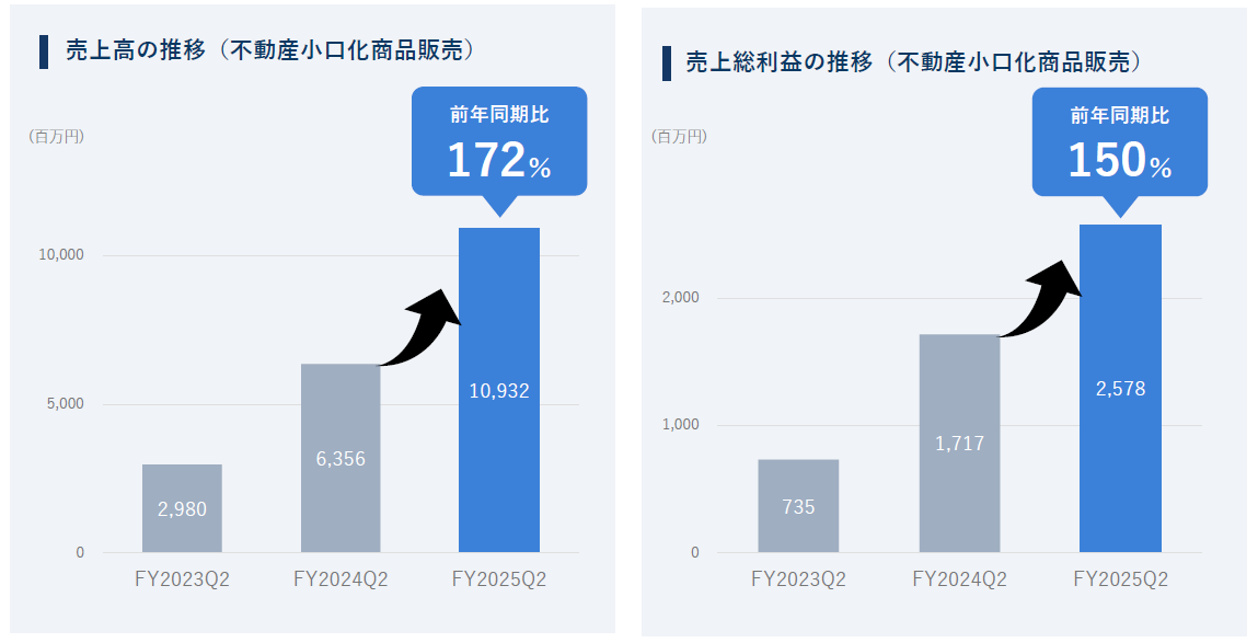 不動産小口化事業は、2Qで売上109億円(前年同期比172%)・売上総利益25.7億円(同150%)を達成しました。年間販売目標200億円に対し、上期販売総額111.4億円(税込)・進捗率55.7%と好調に進捗しております。