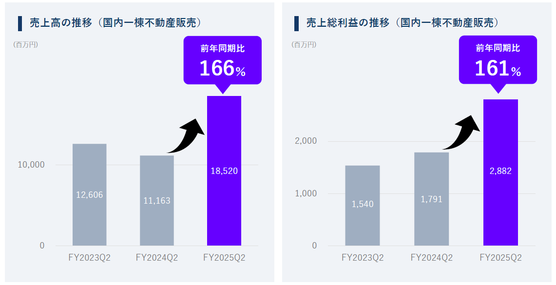 主力事業である一棟収益不動産販売事業も、2Qで売上185億円(前年同期比166%)・売上総利益28.8億円(同161%)を達成し、成長率は昨年を大きく上回っています。