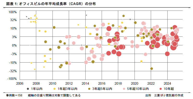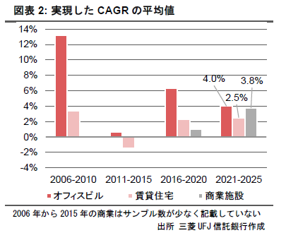 2. 最近5年間に実現したCAGRは3%前後が平均像。また、すべての期間で、オフィスビルが賃貸住宅を上回っている。
