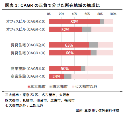 3. 年平均成長率(CAGR)が0%以上の物件群のうち、三大都市所在は80%。一方、CAGRがマイナスの物件群では、三大都市は52%に減少。しかし、賃貸住宅はCAGRの正負にかかわらず地域構成比に顕著な差がない。商業施設は、オフィスと同様の傾向。