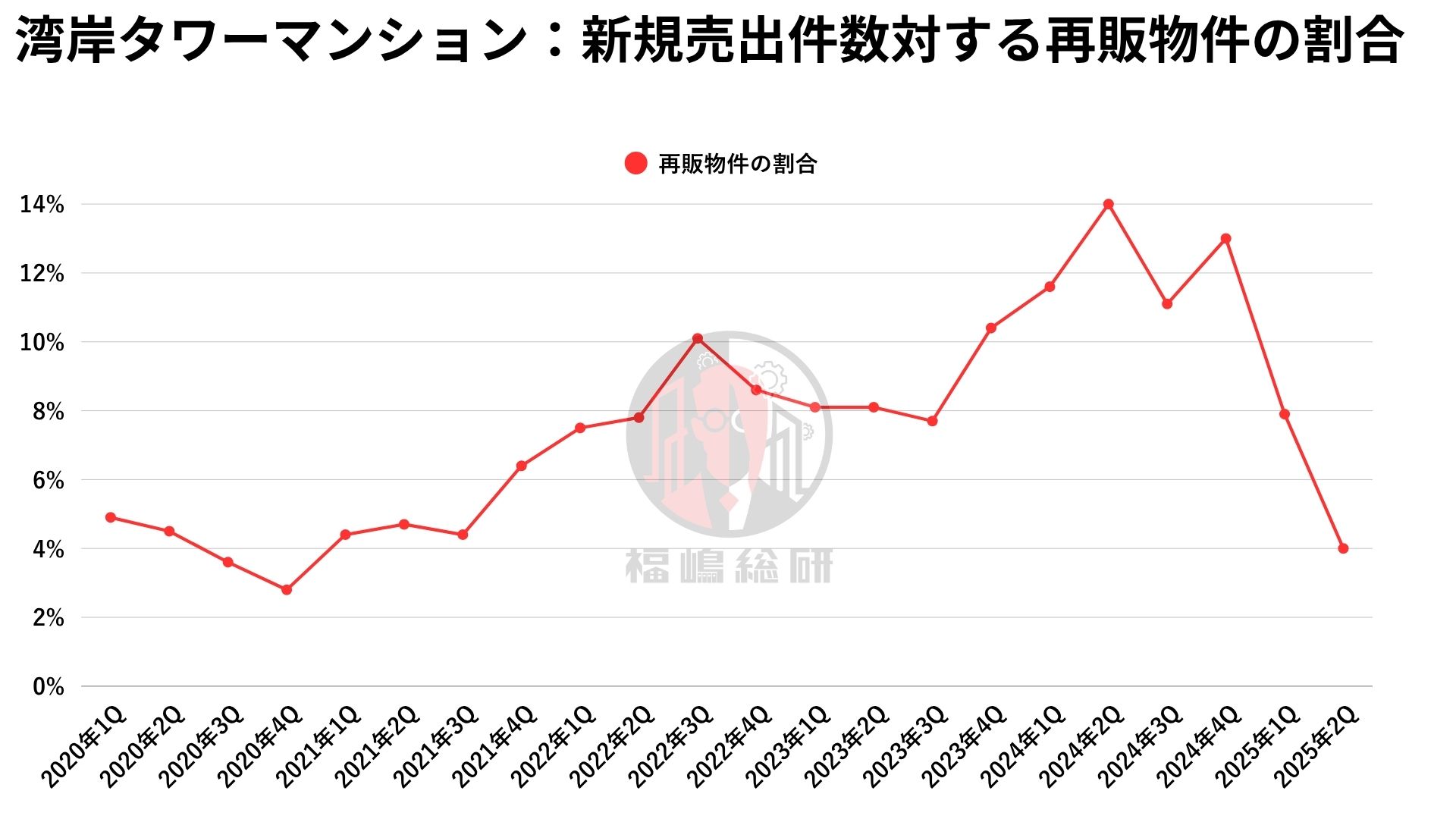 2024年まではこの割合が高まり、ピークを迎えていました。再販業者は短期的な利ざやを狙うため、価格上昇局面では積極的に仕入れを行い、市場に大量の再販物件が出回ります。ところが、2025年に入ってからは状況が一変。割合は大きく減少し、コロナ禍以前の水準にまで戻りました。
