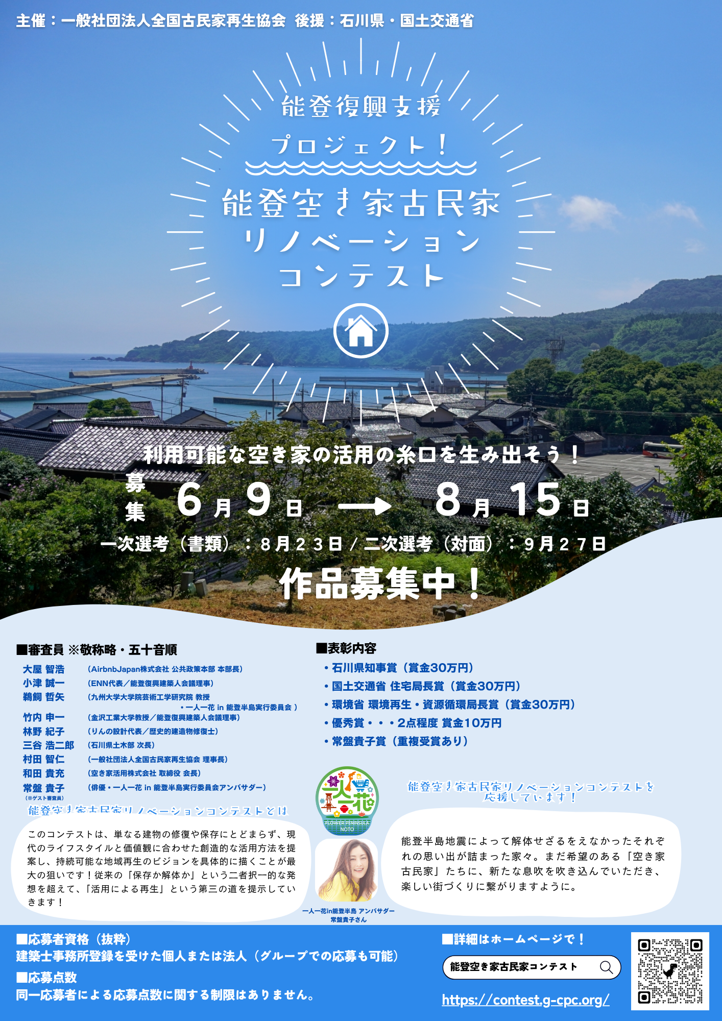 「能登空き家古民家リノベーションコンテスト」は、復興と地域再生の取り組みとして活動する「一人一花 in 能登半島プロジェクト」を応援しています。同プロジェクトの代表である九州大学大学院芸術工学研究院 教授・鵜飼哲矢氏に加え、同プロジェクトのアンバサダーを務める俳優・常盤貴子氏が、本コンテストに審査員として参画することが決定しました。