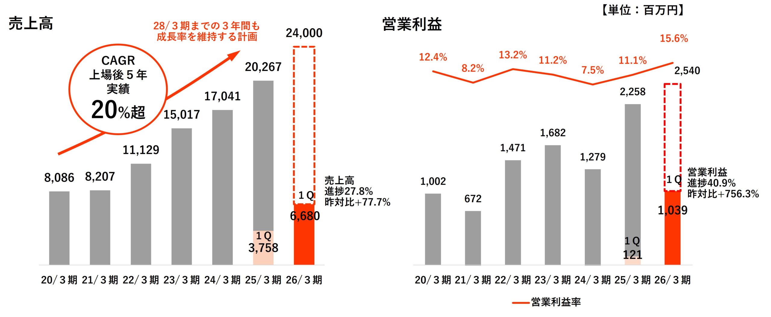 売上高66.8億円(yoy+77.7%)、経常利益9.88億円(yoy+947%)となり、利益における年進捗では43.0%と安定感のある1Q決算となりました。