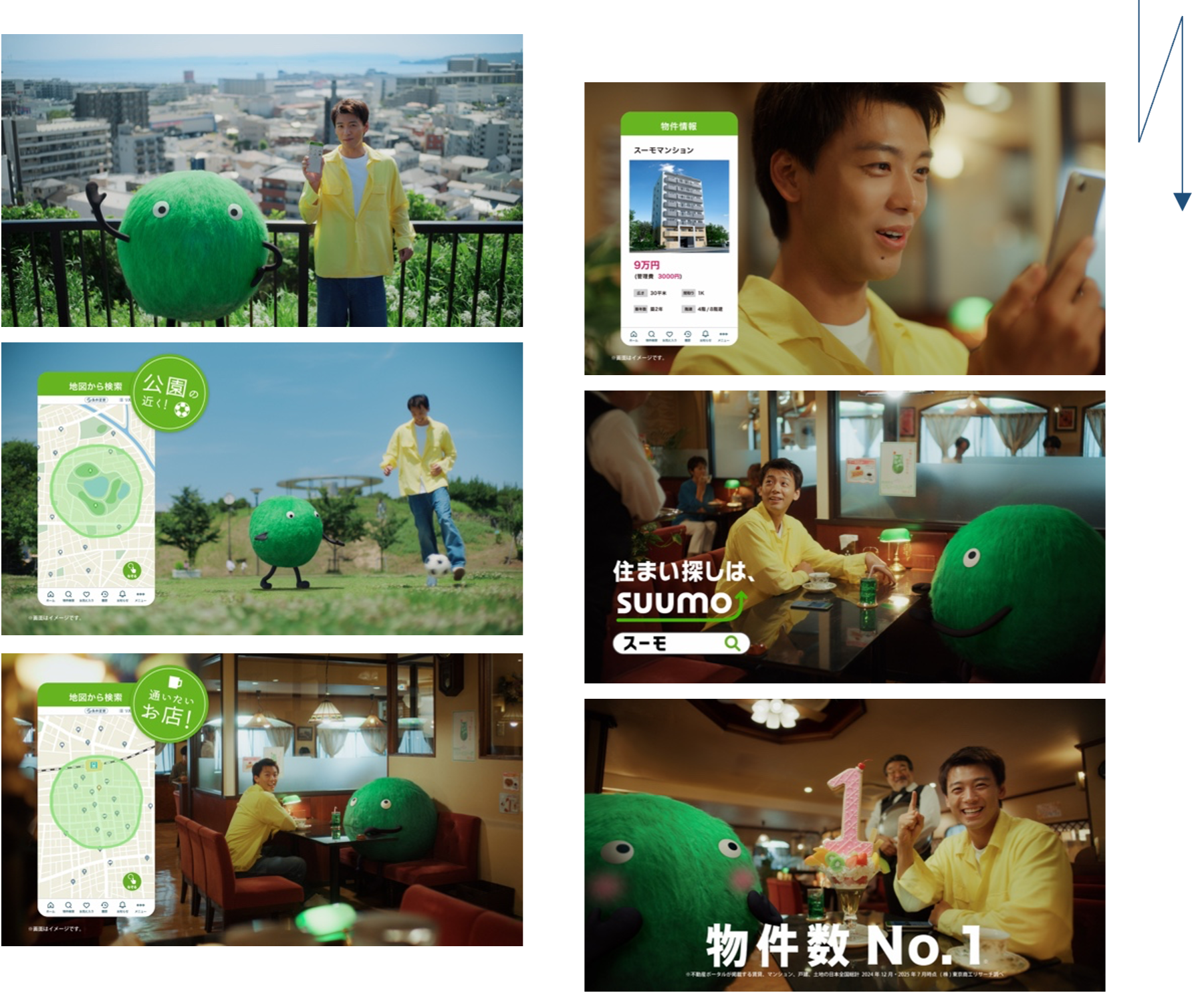 竹内涼真さんとスーモが登場する本CMは、「地図からなぞって探す」という住まい探しのスタイルを、テンポよく描いたストーリーです。街並みをバックに、カメラ目線で「部屋探しは、場所からでしょ!」と語りかける竹内さん。『SUUMO』で地図をなぞって検索すると、次々とスポットが切り替わり、公園やカフェを巡るシーンへと展開していきます。なかでも、自然を感じる公園ではスーモとサッカーを楽しむシーンや、風が心地よく吹き抜ける中、竹内さんが「風、気持ちいい~」とひと言つぶやく演出も。風を感じながら街を歩くことで、“その街で暮らすイメージ”が自然と膨らむような空気感が表現されています。